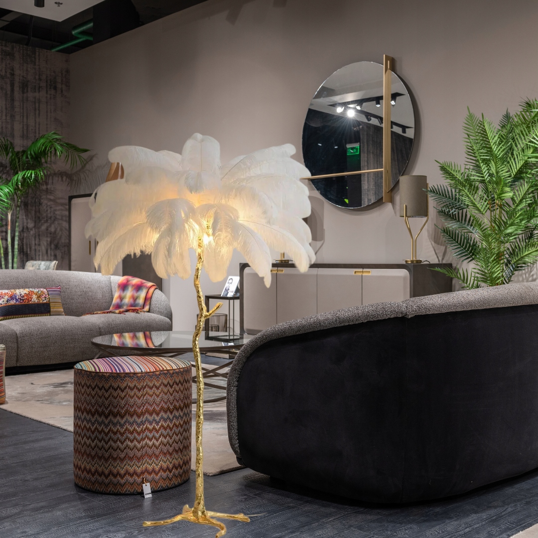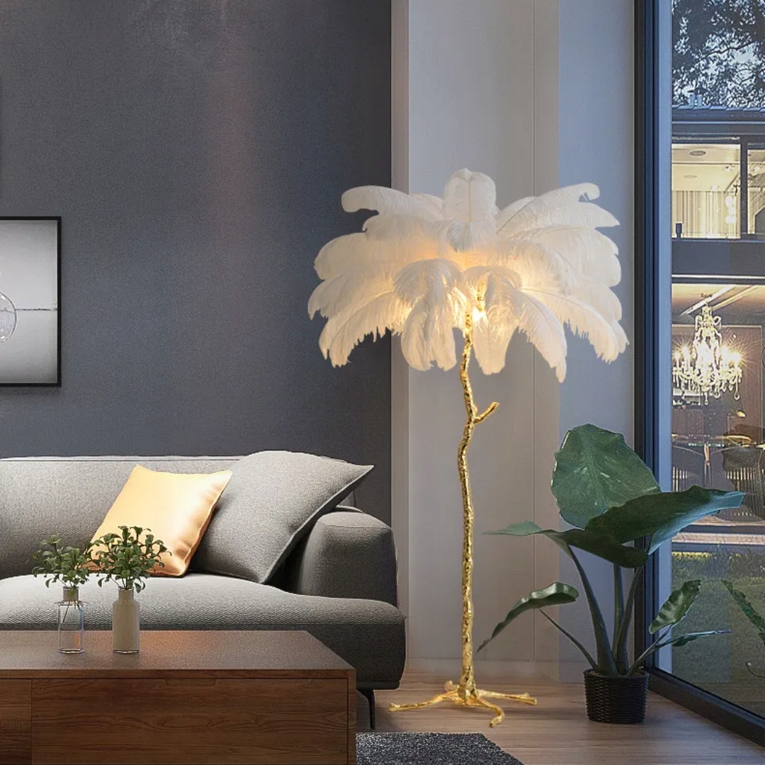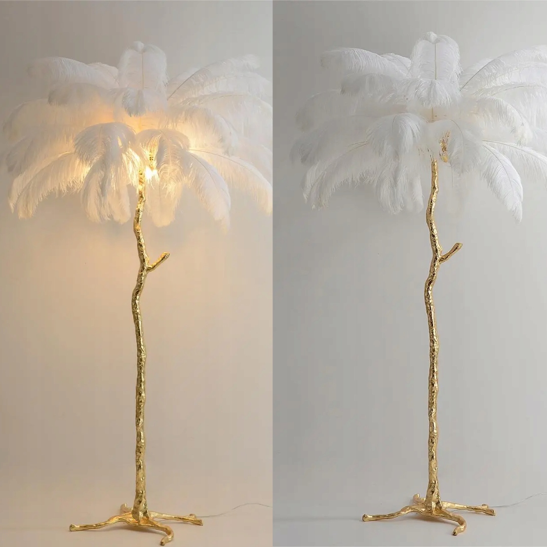 Абажур прикрашений густо розташованими пір'ям , створюючи візуальний ефект, який вражає своєю надзвичайною естетикою.