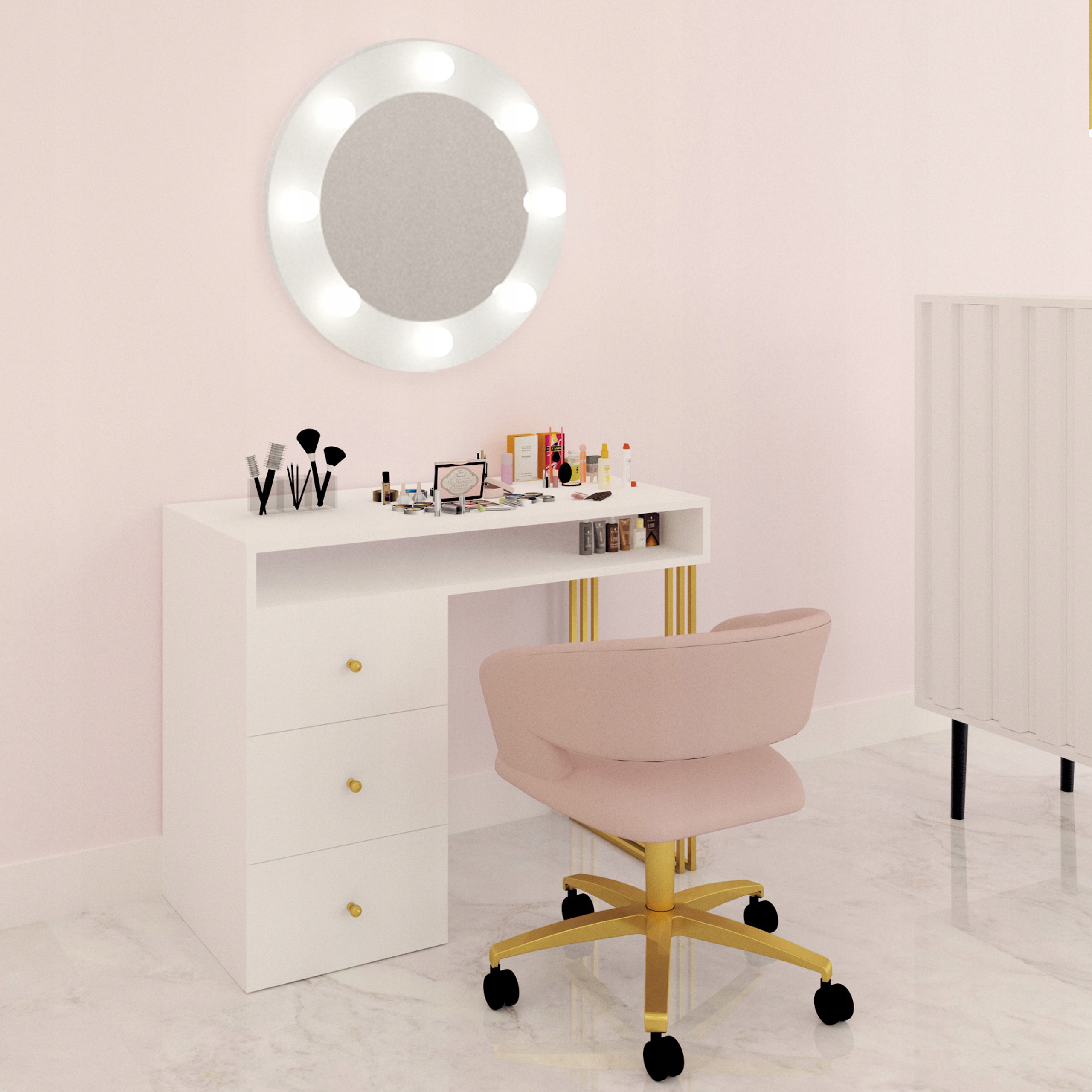 Туалетний столик Клара з круглим повноціннимдзеркалом - це функціональний і необхідний предмет меблів для кожної жінки. Ідеальне місце для макіяжу, а також куточок, де можна подбати про своє волосся. 8 світлодіодних лампочок чудово освітлять ваше обличчя.
