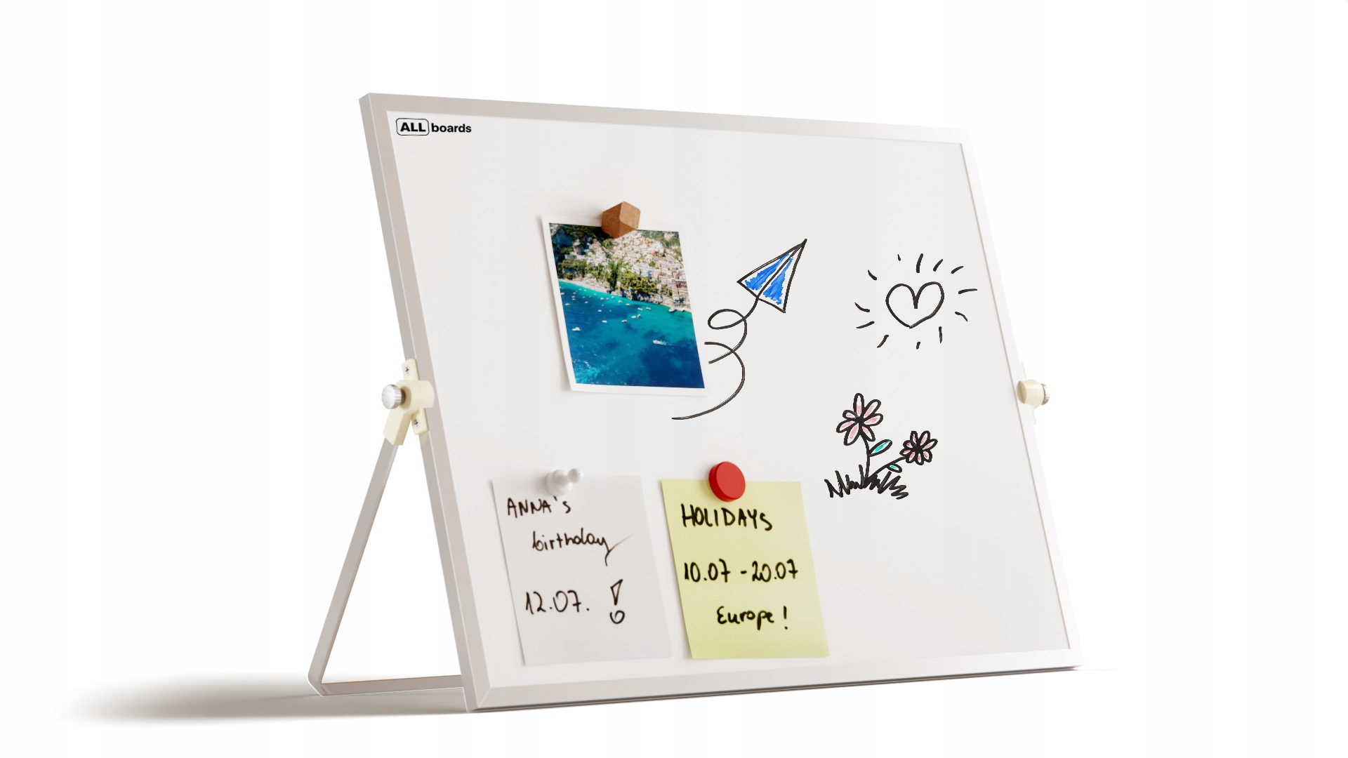 - Магнітні властивості - Ви можете легко відображати картки зі списками завдань, улюбленими листівками або фотографіями близьких людей. Прикріплення їх із вибраними традиційними магнітами і мають те, що завжди важливо для вас на очах. Він був обладнаний регульованим кадром, який дозволяє встановити його відповідно до власних потреб. 4 Дошка обертається, що забезпечує легкий і швидкий доступ до обох сторін - один з них може бути використаний для офісних або освітніх цілей, а другий для творчих ігор.