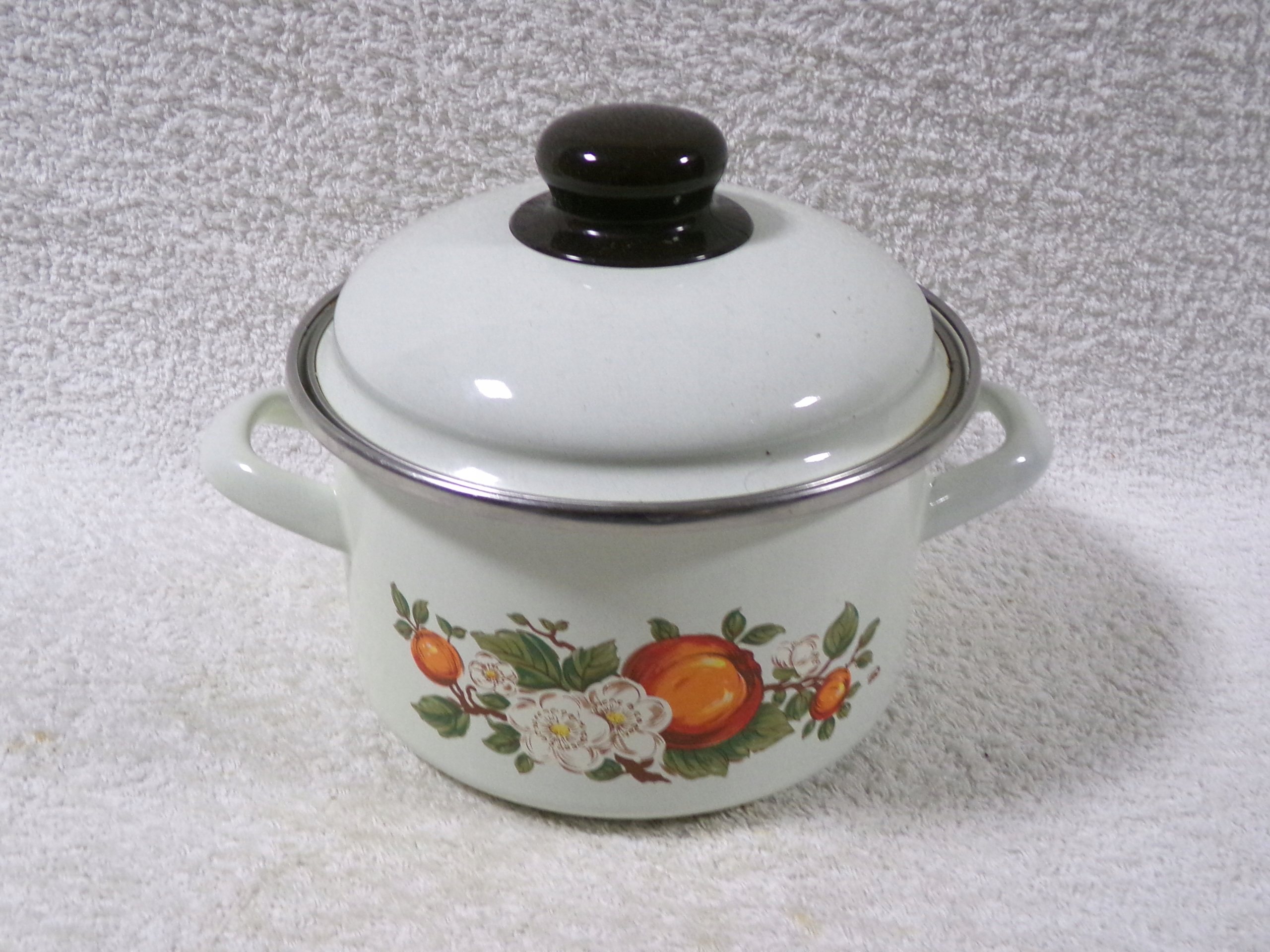 Каструля міцна емальована, діаметр центру 18 см, висота 17,5 см, об'єм 1,5-2 л, вага 0,87 кг. Хороший стан, без пошкоджень, потребує очищення, у мене закінчилася спеціальна паста.