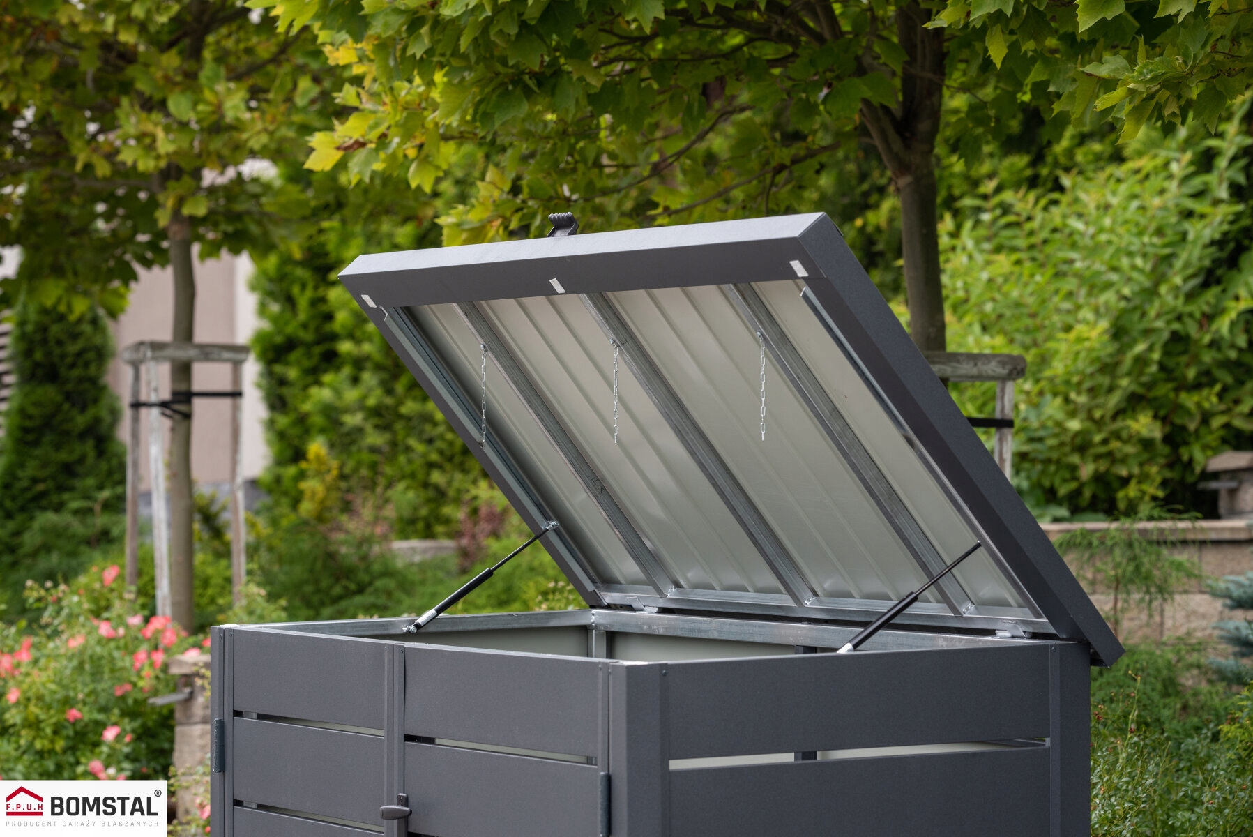 Сміттєві контейнери покривають 5x 240 л (корпус сміттєвого колеса) виготовлений з міцного, високоякісного металу. Оснащений суцільними дверима та клаптям на телескопічних циліндрах, полегшуючи кидання сміття та сегрегації відходів, допомагає підтримувати порядок та естетику навколишнього середовища. Громадяни сміття не тільки функціональні, естетичні, але й підтримують ефективну переробку та догляд за навколишнім середовищем.
