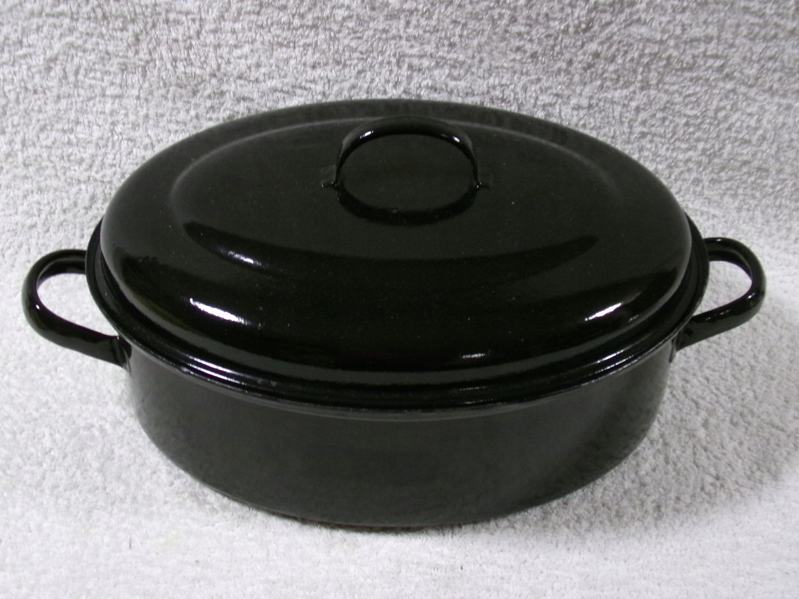 Жаровня металева емальована з діаметром центру 33,5х25 см, висотою 20,5 см, об'ємом приблизно 6-8 літрів, вагою 1,94 кг. Дуже хороший стан, без пошкоджень.