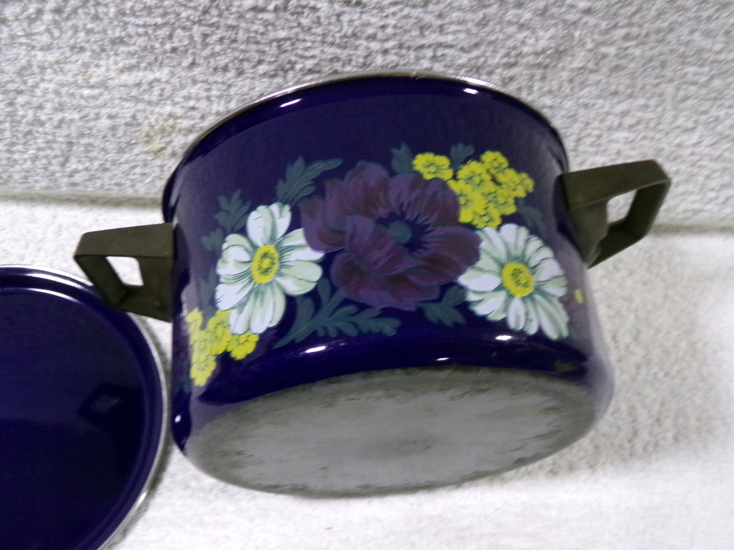 Емальований горщик діаметром 21 см, висотою 13 см, вагою 1,56 кг. Дуже хороший стан, без пошкоджень, жодної ручки на кришці.