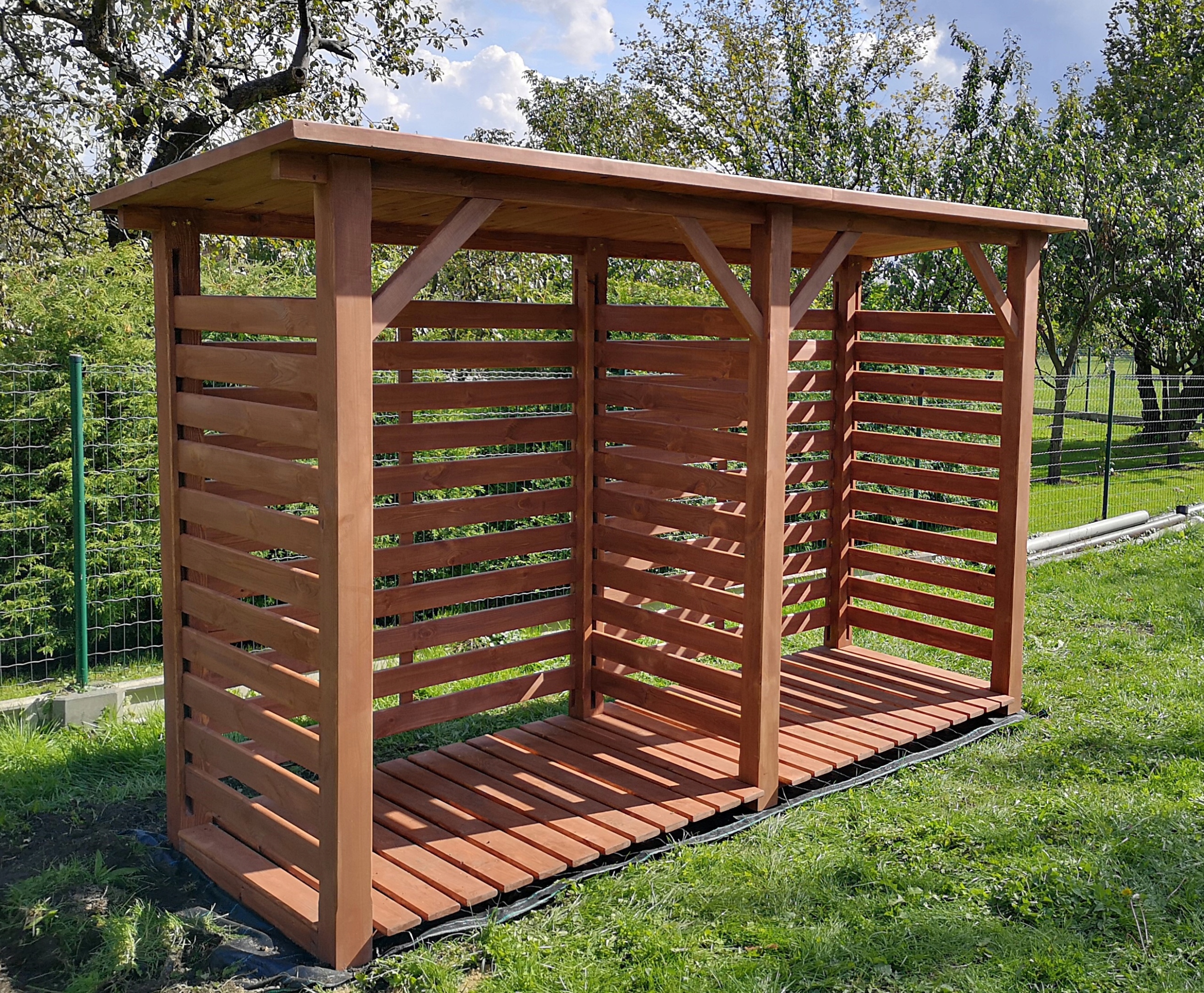 ➔ Стійкість – опалубка дров’яного сараю змонтована в пази масивних колон, а вся конструкція з’єднана спеціальними гвинтами, що робить конструкцію дуже стабільною та довговічною. захист деревини, що зберігається