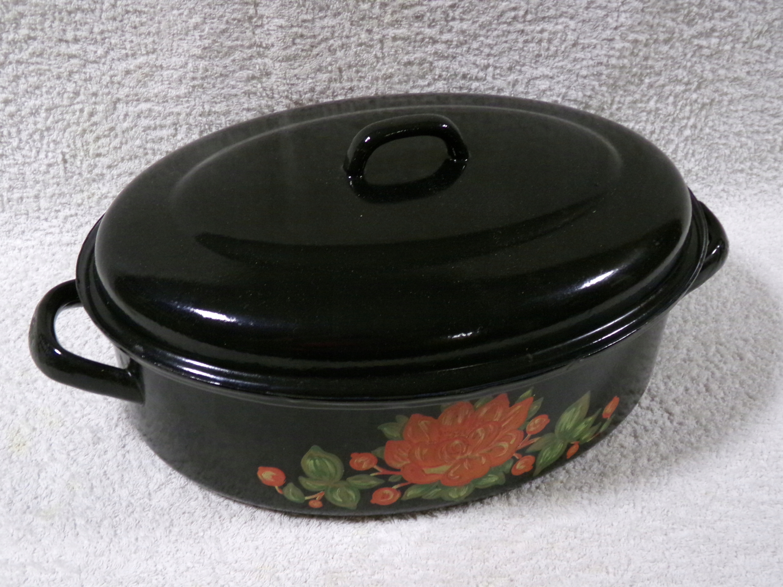 Жаровня металева емальована з діаметром центру 33,5х25,5 см, висотою 16,5 см, об'ємом приблизно 5 літрів, вагою 1,81 кг. Дуже хороший стан, без пошкоджень, незначні сліди користування.