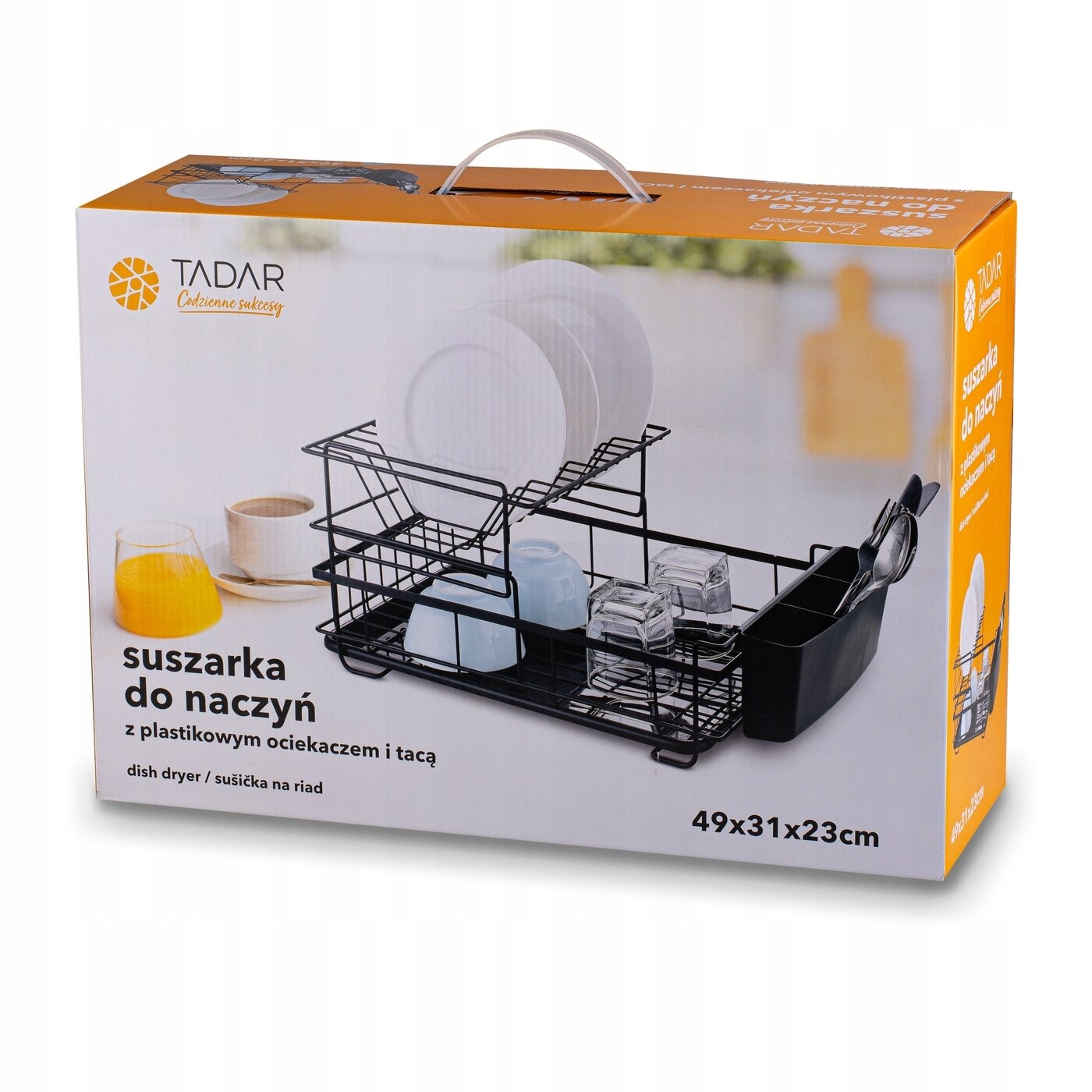Чорний, дворівневий Tadar 43 x 29,5 х 23 см судинна сушарка тверда і добре виготовлена. Разом з нею ви отримуєте лоток та відповідні столові прибори, розділені на 3 частини. Цілий був виготовлений з пластикового та порошкового металу. Він також стійкий до вологи та легко доглядати. Його стабільна конструкція полегшує налаштування на раковині. На домашній кухні це займе мало місця і дуже просторий. Він був розроблений для безпечного та гігієнічного висихання посуду (тарілки, окуляри, чашки та чашки). Він також добре виснажує крапельну воду та прискорює висихання столу через велику вентиляцію. Випорожнення її з води швидко і неприємно. Продукт також легкий, тому ви можете легко змінити його положення або вийняти з стільниці для очищення. Він містить до 10 тарілок різних типів та розмірів. Це також допоможе вам організувати та організувати простір у раковині. Верхній рівень знімається, і після встановлення його ви можете бути впевнені, що він не впаде випадково, навіть коли сушарка буде переміщена з місця на місце.