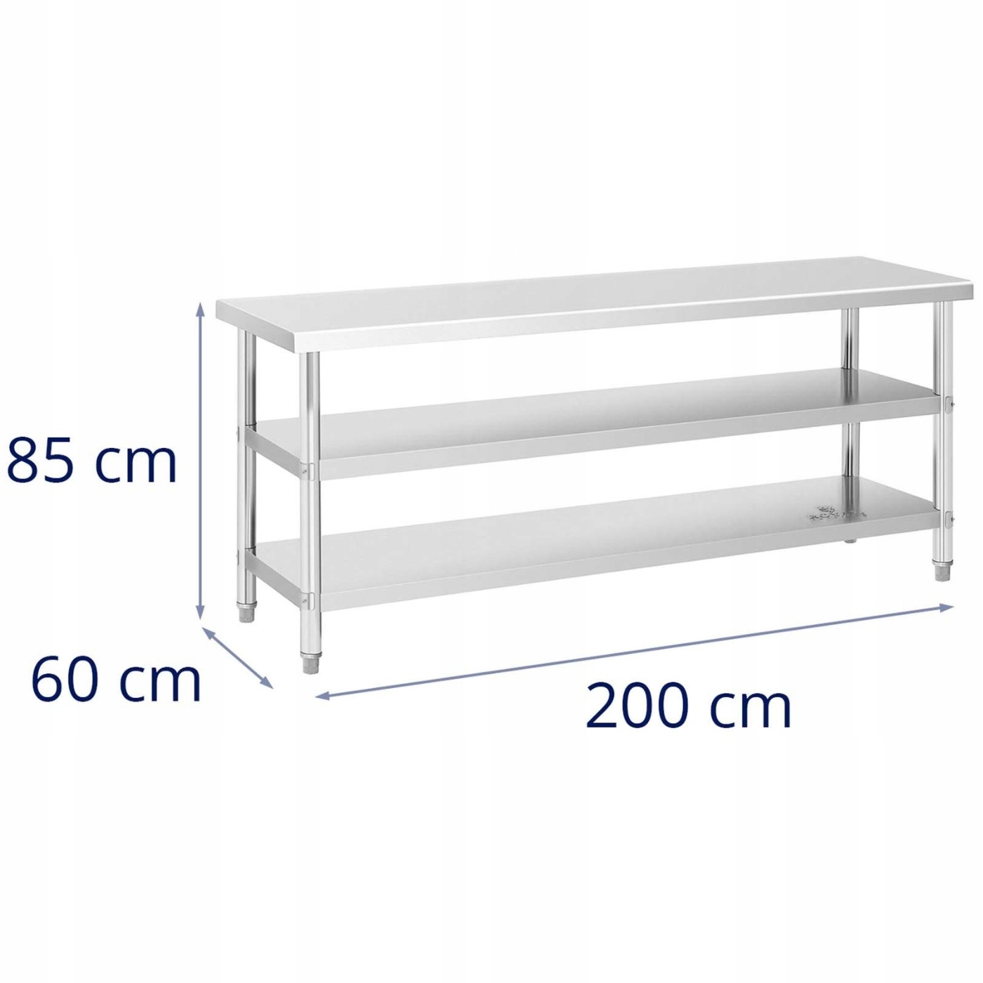 Робоча поверхня столу з нержавіючої сталі становить 200 х 60 х 5 см і забезпечує багато місця для щодня працювати. Дві полиці служать додатковим місцем для зберігання, що дозволяє організувати простір на робочому місці. Завдяки їм ви можете зберігати предмети висотою 29/26 см.