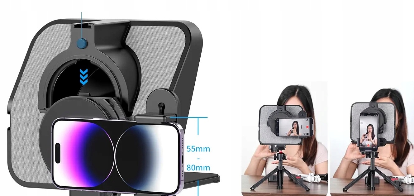 Пристрій, який використовується для відображення тексту з телефонів/смартфонів і планшетів шириною до 6,5 дюймів. Скляна панель працює як одностороннє дзеркало, відбиваючи чіткий текст, який видно лише з одного боку та невидимий для камери чи телефону, які використовуються для запису відео.
