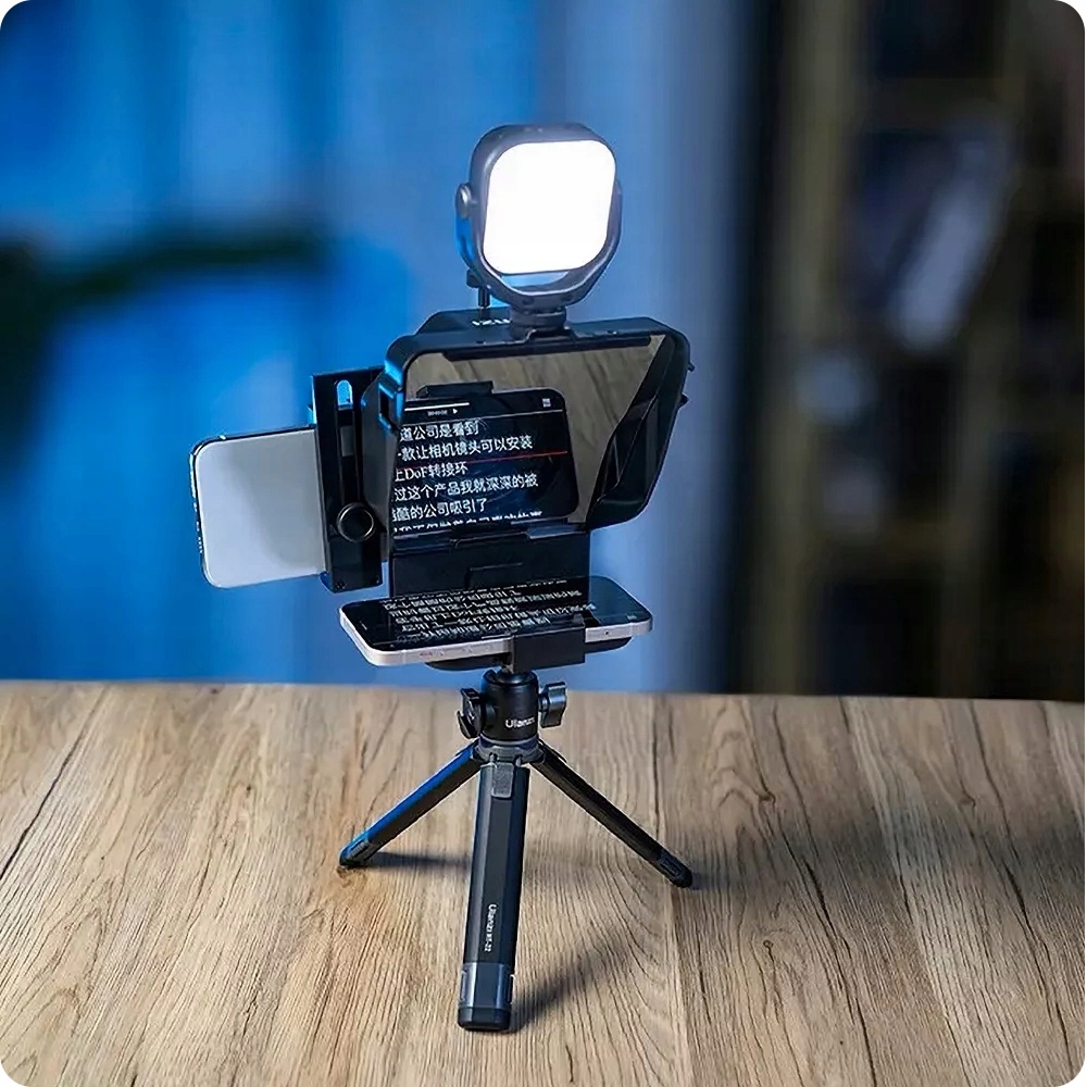 ✔️ Телесуфлер оснащено кріпленням 1/4 дюйма, що дозволяє легко встановити його на штатив або тримач. Він також має три кріплення холодного башмака, що дозволяє розширити набір додатковими аксесуарами, такими як мікрофон, світлодіодна лампа або екран. Завдяки цьому телесуфлер добре працюватиме в різних умовах запису, навіть у полі, де доводиться мати справу з несприятливими погодними умовами.