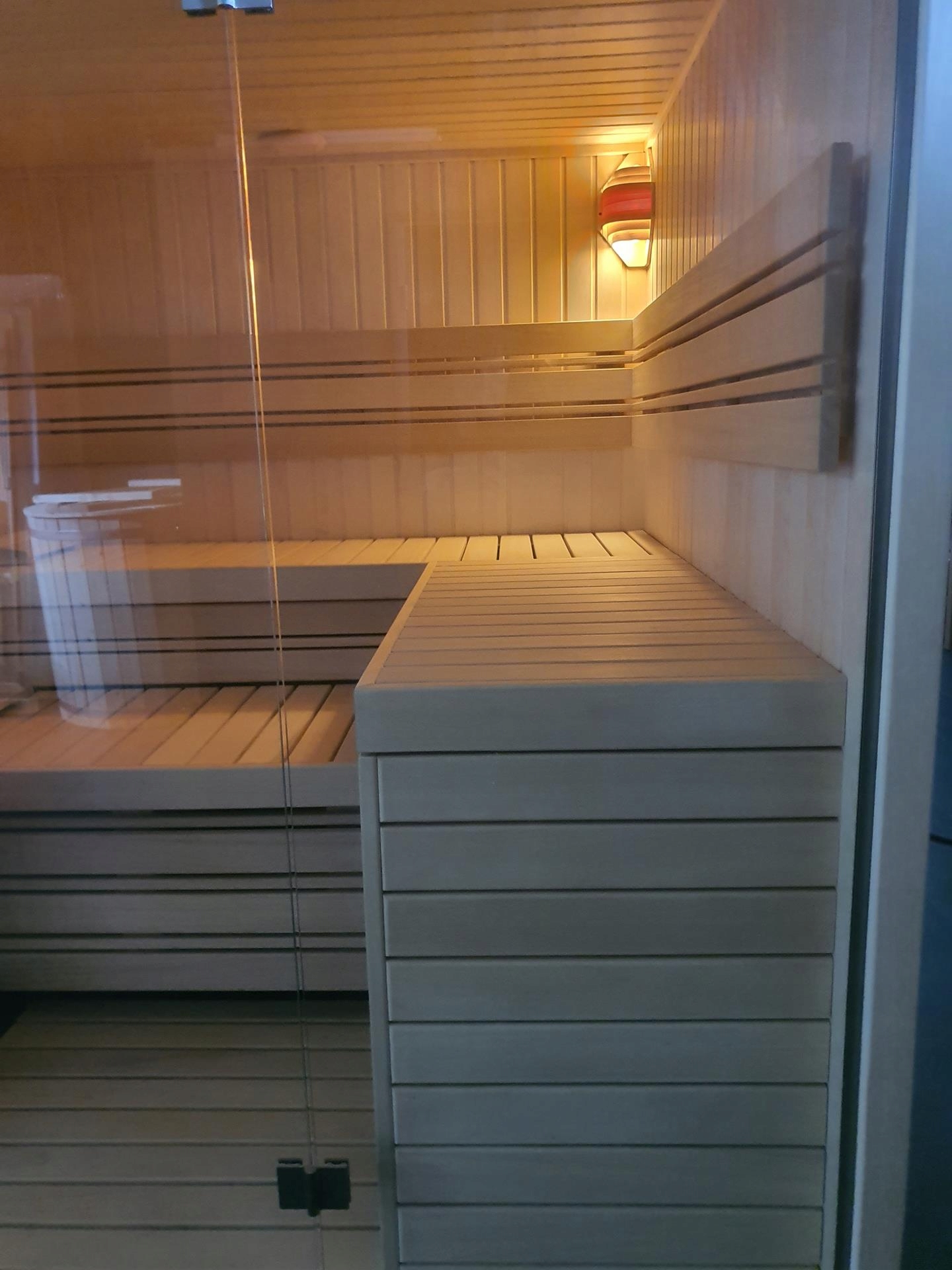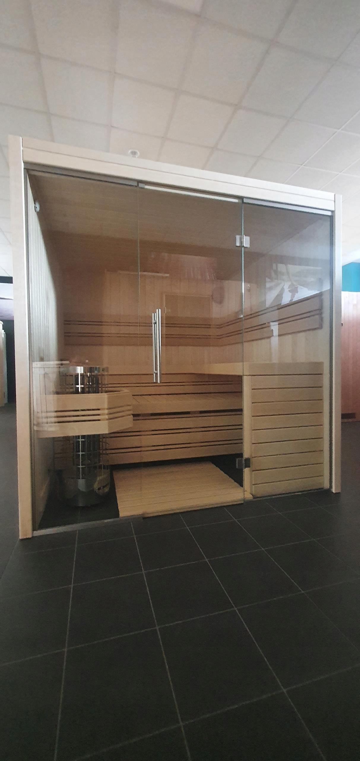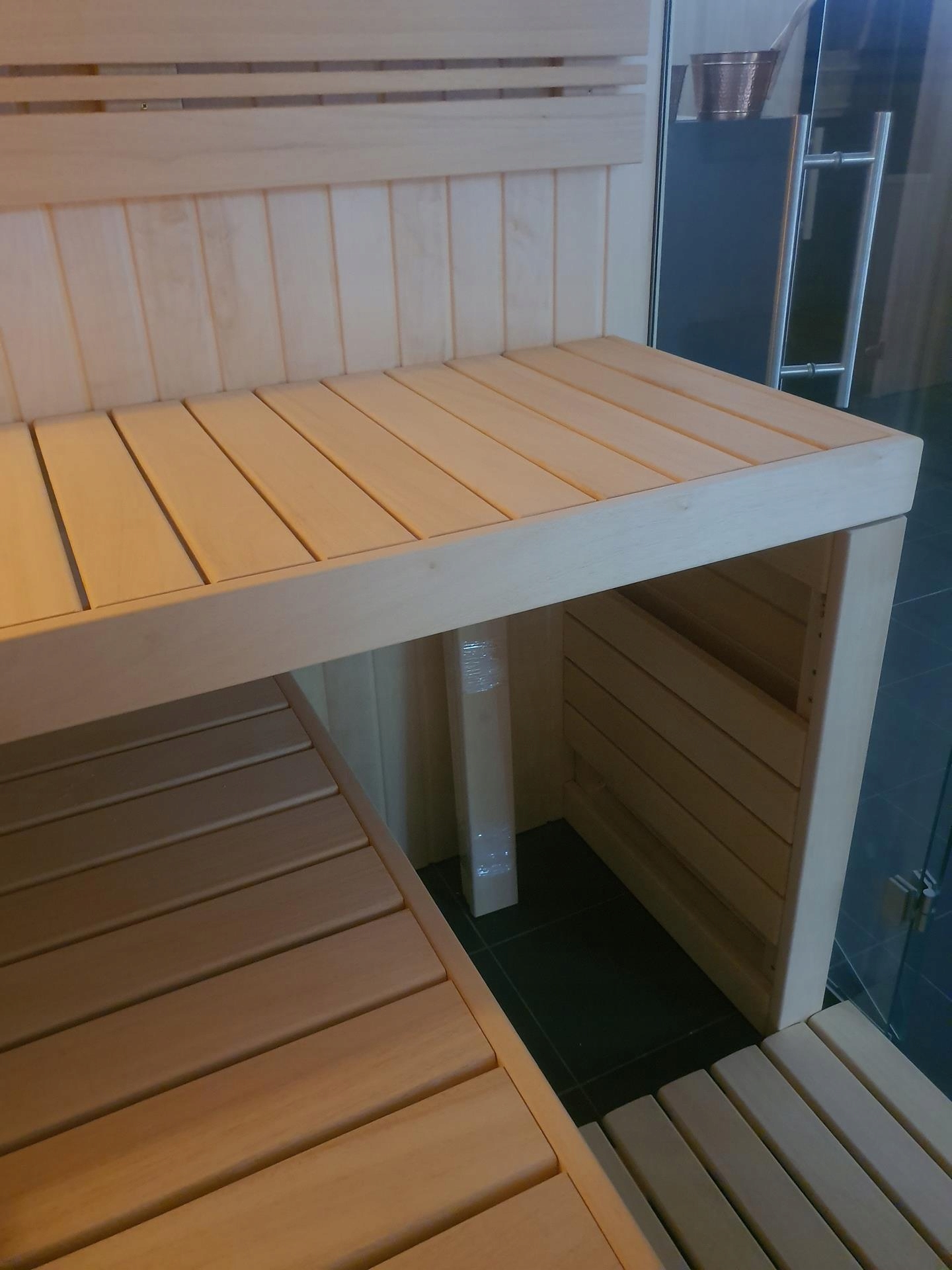 Сауна виготовлена з осикової вагонки класу А товщиною 16 мм. Стіни товщиною 65мм, утеплені мінеральною ватою 50мм. Повноскляний фасад, без порога, прозорий. Лавки, кожух печі, спинки, помост, підголівники з ненагріваючої деревини абачі.