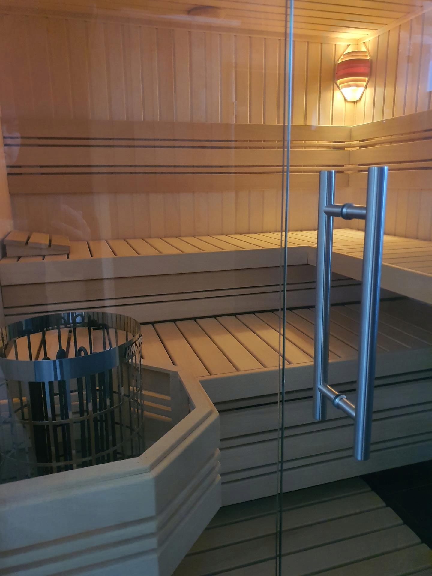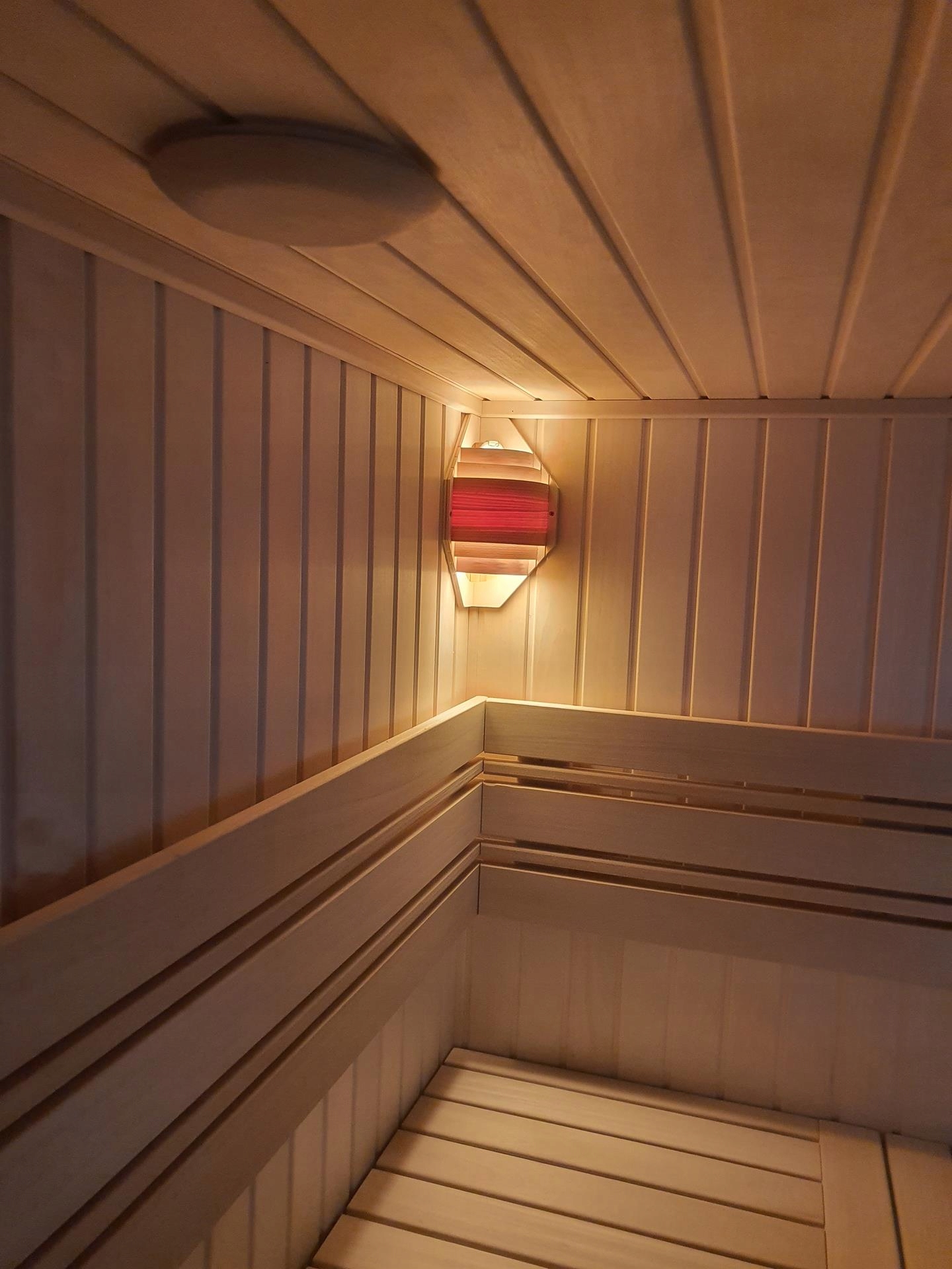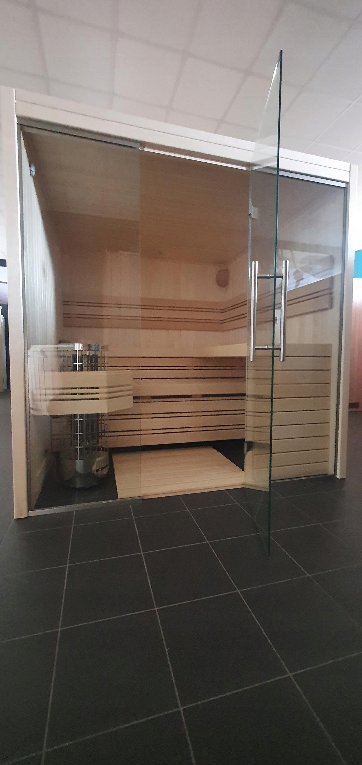 Сауна виготовлена з осикової вагонки класу А товщиною 16 мм. Стіни товщиною 65мм, утеплені мінеральною ватою 50мм. Повноскляний фасад, без порога, прозорий. Лавки, кожух печі, спинки, помост, підголівники з ненагріваючої деревини абачі.