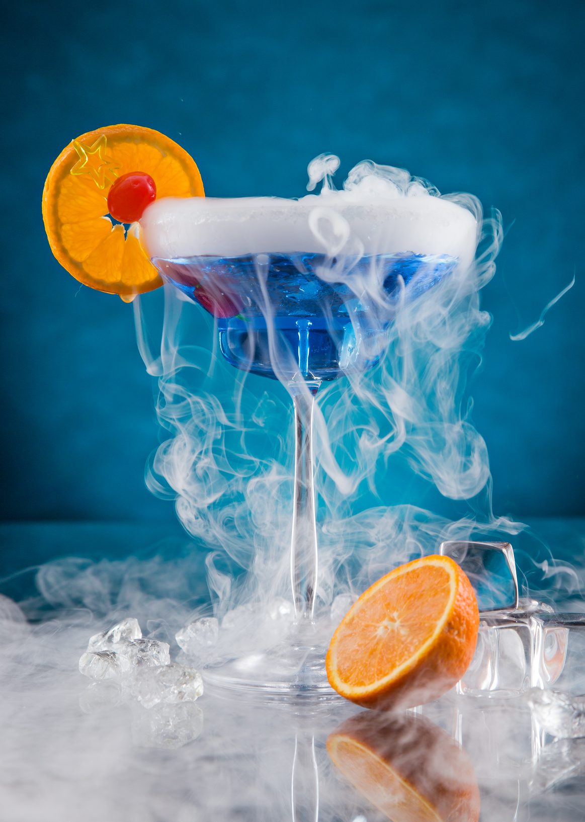 Сухий лід ідеально підходить для охолодження напоїв. Дуже швидко знижує температуру напоїв, створюючи ефект «димлячого напою». Його перевагою є сублімація - прямий перехід з твердої фази в газоподібну - це означає, що сухий лід не залишає слідів і тому не розбавляє напій. Це також не впливає на його смак і запах.
