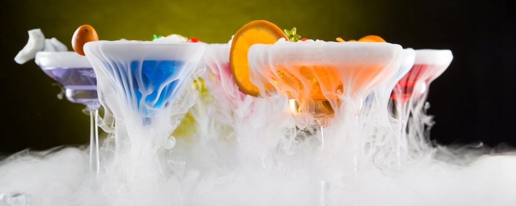 Сухий лід ідеально підходить для охолодження напоїв. Швидко знижує температуру напоїв, створюючи ефект «димного напою». Його перевагою є сублімація - прямий перехід з твердої фази в газоподібну - це означає, що сухий лід не залишає слідів, а значить - не розбавляє напій. Це також не впливає на його смак і запах.