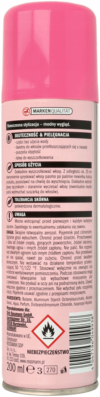 Ретельно розчешіть волосся. З відстані приблизно 20 см рівномірно розпиліть невелику кількість засобу на волосся пасмо за пасмом і залиште на деякий час для висихання. Ретельно висушіть голову рушником і ретельно розчешіть волосся (залишки порошку видаліть феном).