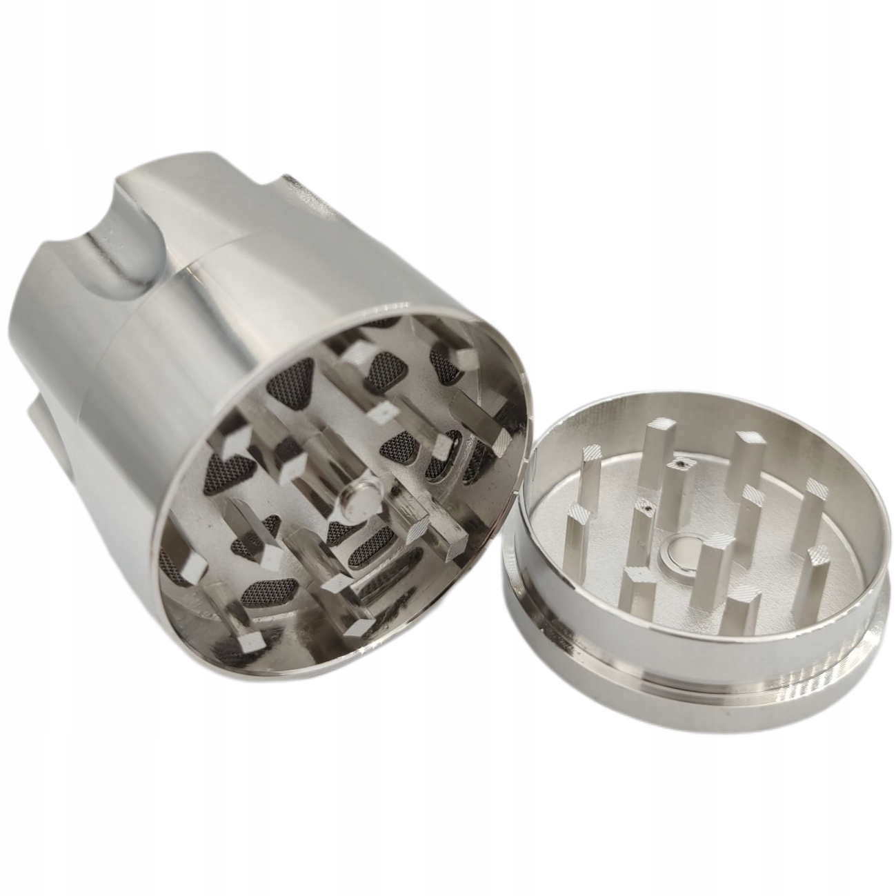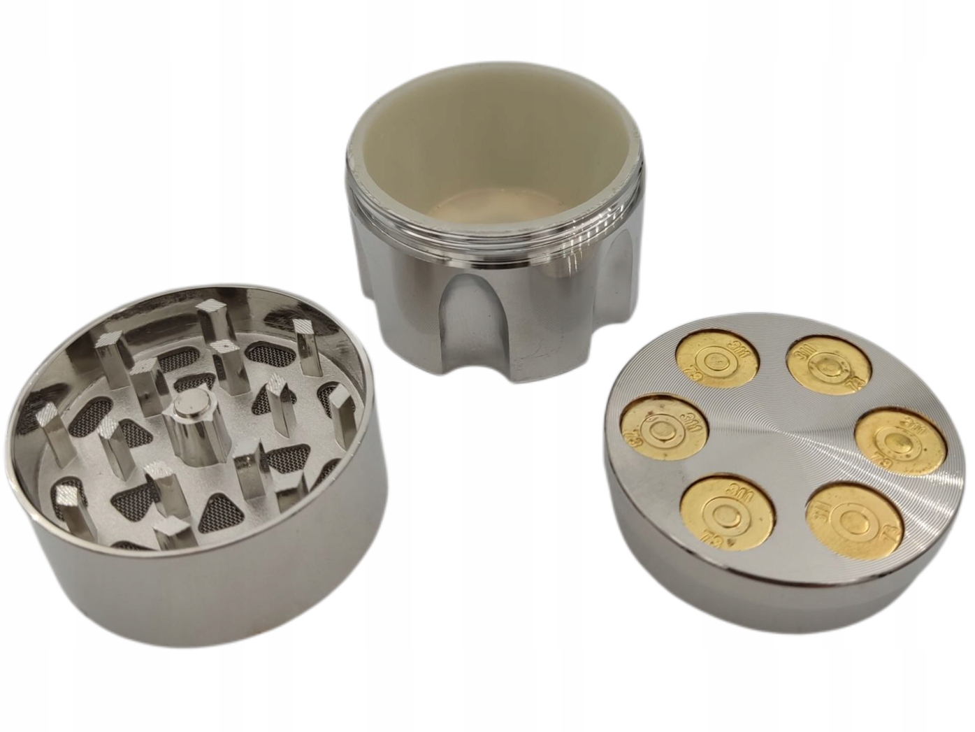 Міцна сталева шліфувальна машина з жорсткими та гострими зубами. Він відмінно подрібнить будь-яку висушену рослину. Він складається з трьох частин.