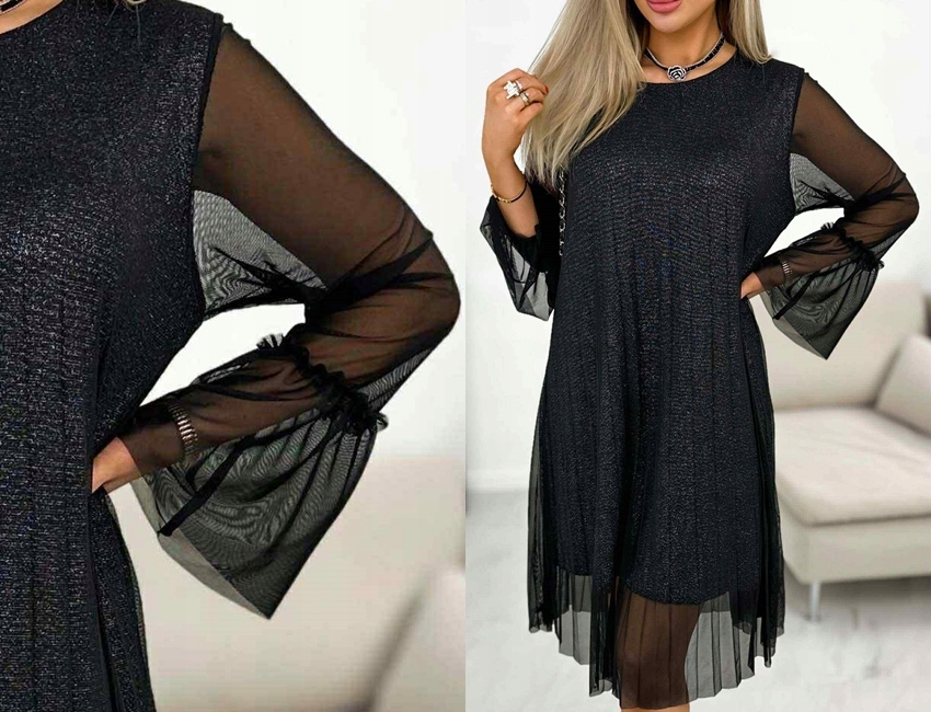 Ефектна сукня з двох шарів. Перший шар металік зі сріблястою ниткою, другий шар чорний тюль з ніжною плісировкою. Крій oversize приховує недоліки фігури навіть у жінок з широкими стегнами. Абсолютна новинка, яка обов'язково повинна бути у вашому гардеробі. Ідеально підходить для вечірнього виходу. Еластичний матеріал.