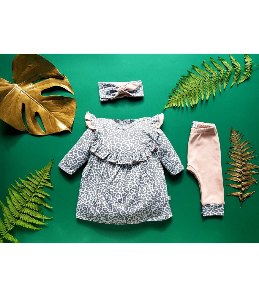 Модний візерунок сірого леопарда з додаванням волана посередині та подвійних крил на рукавах створюють гарне ціле.