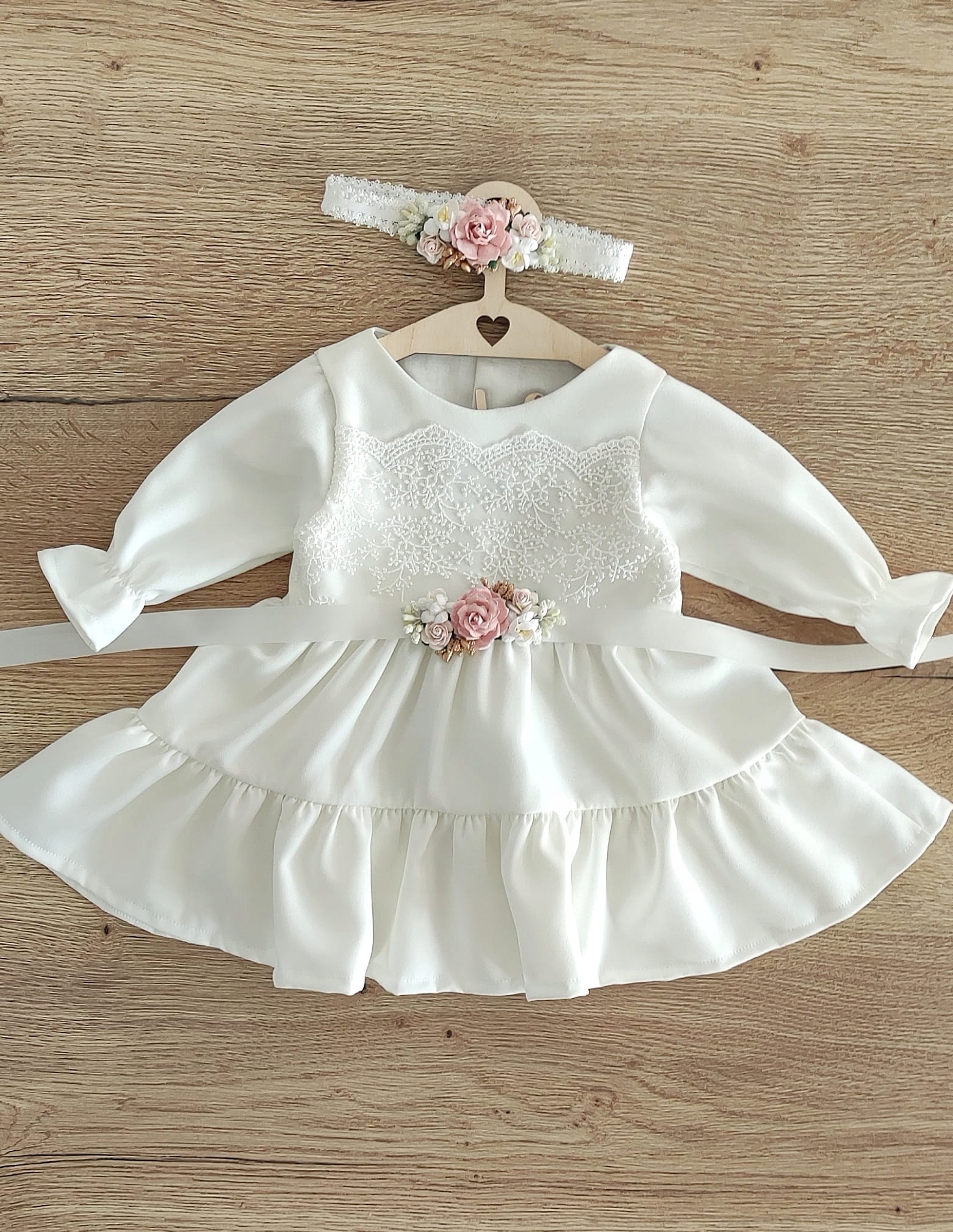 Сукня для хрещення з елегантної тканини без зморшок, оздоблена елегантним мереживом того ж відтінку. Зроблено з бавовняною підкладкою.