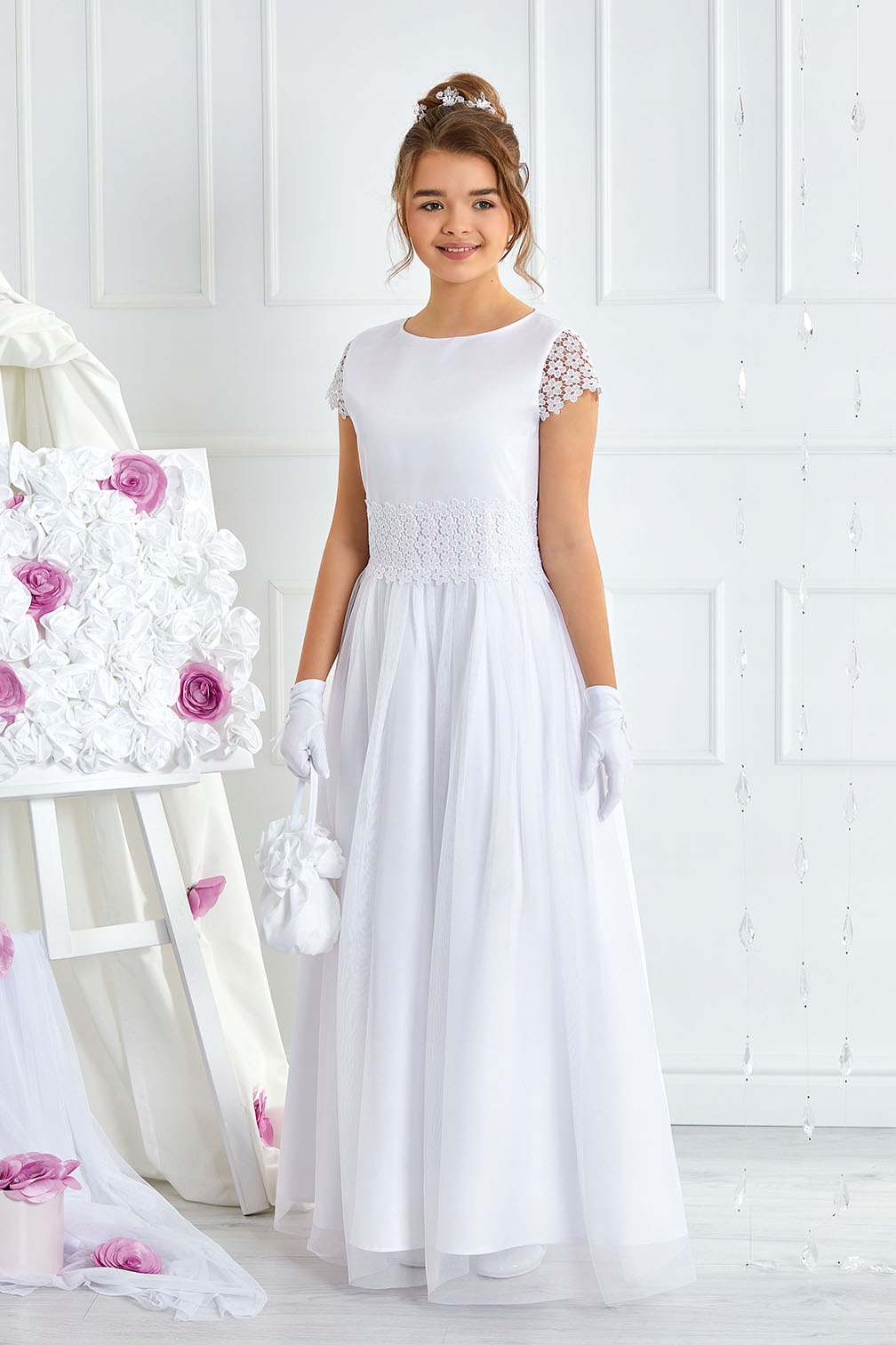 Ця унікальна сукня для причастя була створена для дівчат, які хочуть почуватися справді особливими в один із найважливіших днів свого життя. Поєднання класичного та сучасного стилів робить його творінням, яке не тільки захоплює, але й залишається поза часом. Ця сукня привертає увагу кожною деталлю, пропонуючи елегантність, легкість і досконалість у кожній деталі. Витонченість і розкіш в одному творі. Ніжке мереживо на рукаві та талії додає сукні стиль.Легкий, повітряний тюль додає неймовірної легкості сукні, роблячи її схожою на казку, залишаючись при цьому тонко сучасною. Пояс із тюлю підкреслює пропорції фігури та додає витонченої делікатності всьому, створюючи ідеальний акцент.