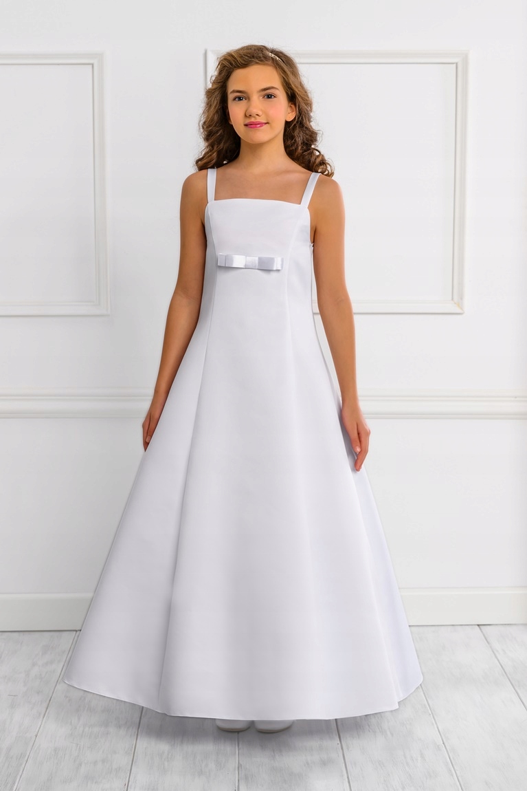 Пропонуємо гарне біле причасне плаття з високоякісного атласу. Всередині вшита під'юбник, завдяки чому плаття красиво сидить. Ззаду сукня застібається на блискавку, а спереду прикрашена гарним бантом.