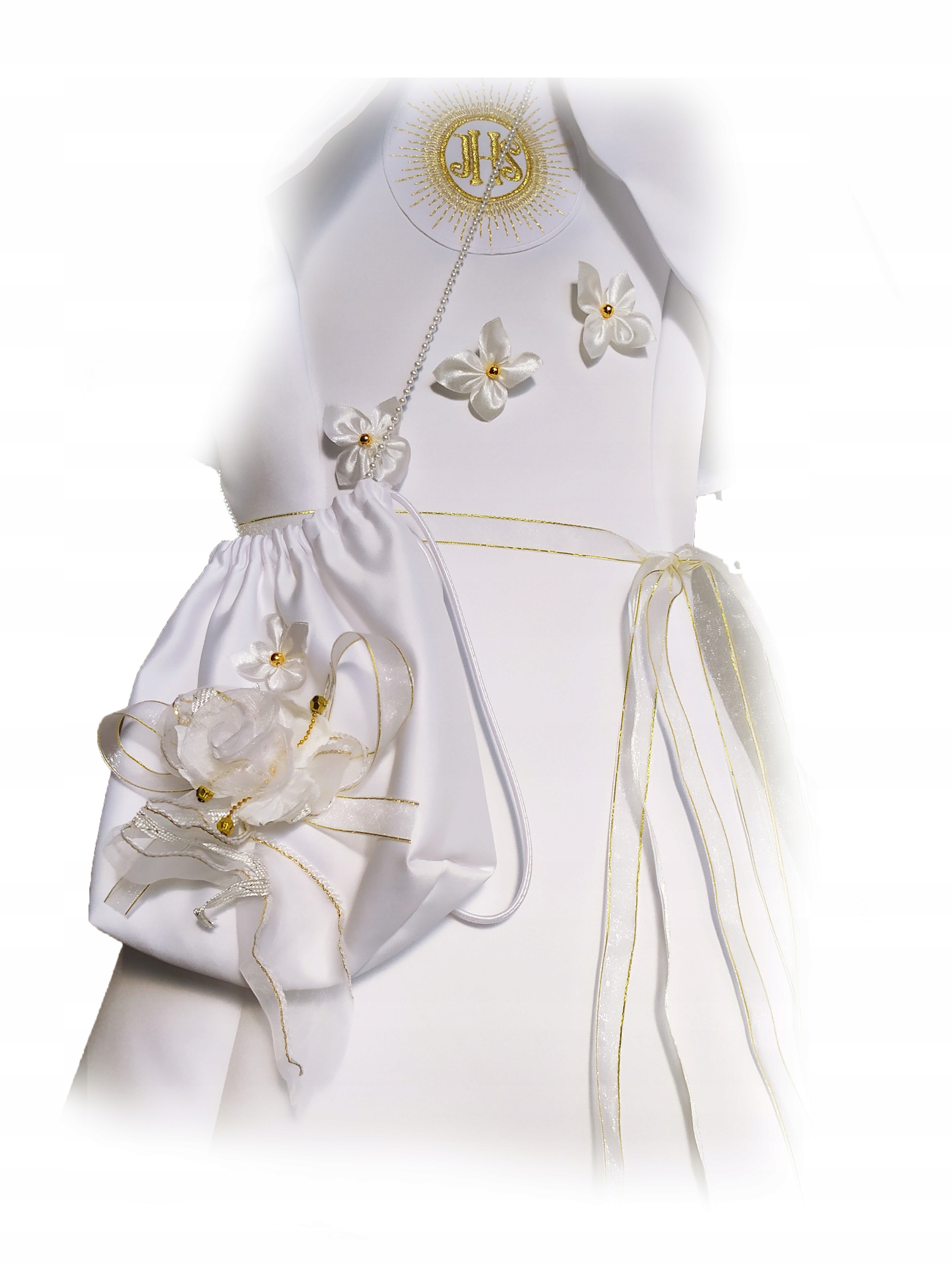 Прекрасна сукня Альба для спілкування в комплекті з Болеро та гаманець. до. Стандарти першого спілкування за розумною ціною! На шиї квітки (або за запитом без). Bolek Open, головоломка з позолотою. (Сріблясті, золотисті або білі - випадкові візерунки.) , і на замовлення -вироблене шиття