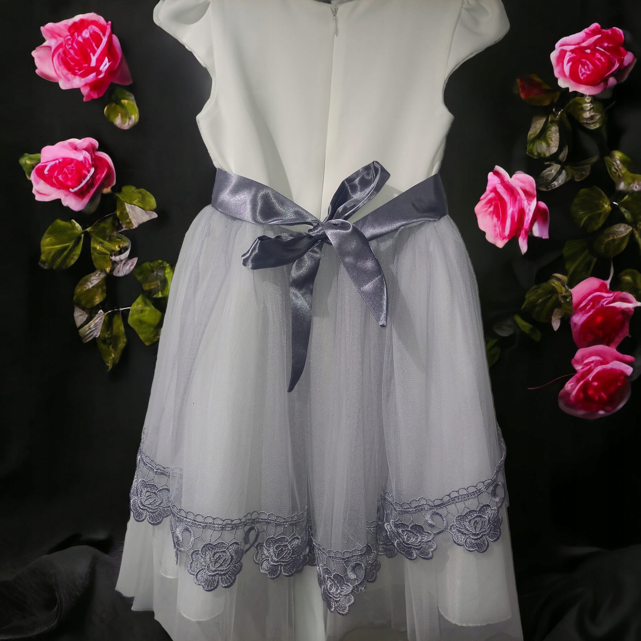 Сукня має бавовняну підкладку, дуже розкльошені, з сірим тюлем і вишитими елементами. Зав'язується на талії. Застібається ззаду на блискавку.