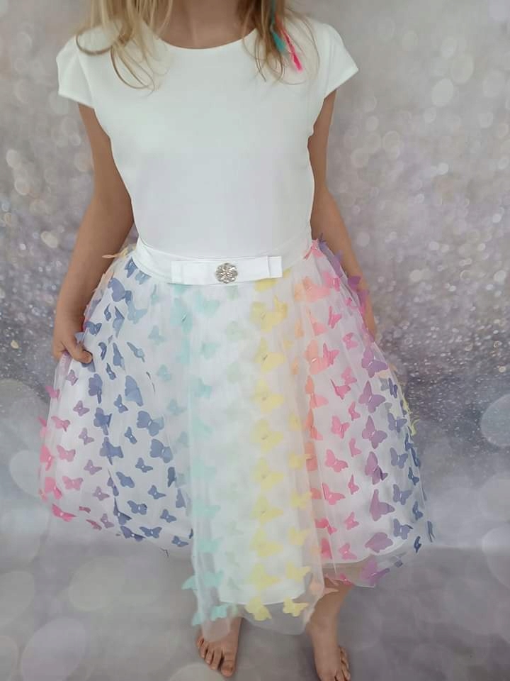 Елегантне плаття з розгорнутою спідницею з тюлю, прикрашеною пришитними, веселковими метеликами. На висоту пояса декоративна, ювелірна квітка та прив'язний ремінь ззаду. На задньому застібці блискавки. Зсередини спідниці, підкладка, атласна тканина та два шари тюлю. Дуже ефективно.