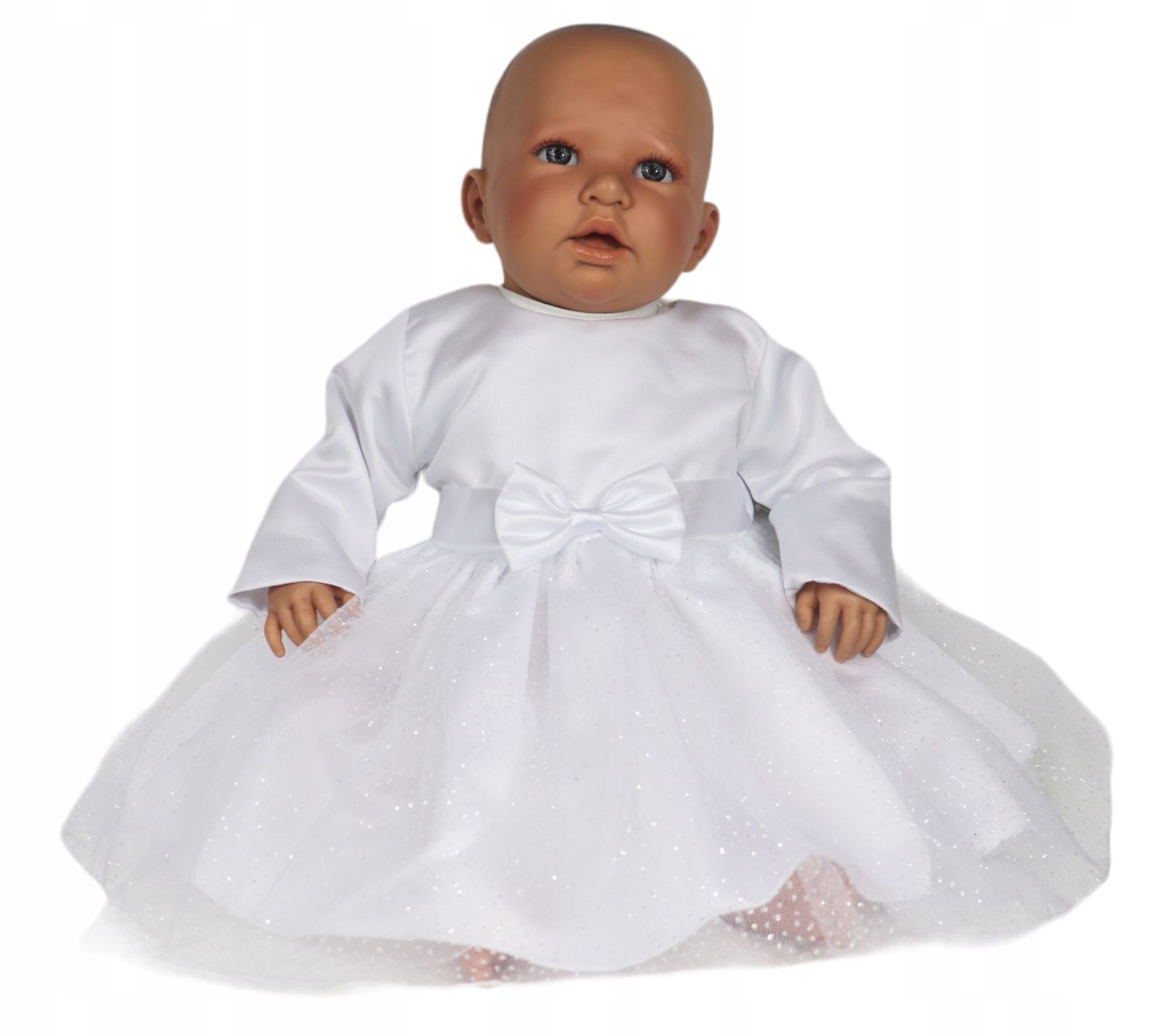 Сукня білого кольору, шит. з елегантної ніжної тканини SATIN, застібається на блискавку ззаду, має рожеву стрічку на талії для регулювання окружності та рожевий бант на ній, на підкладці з бавовни