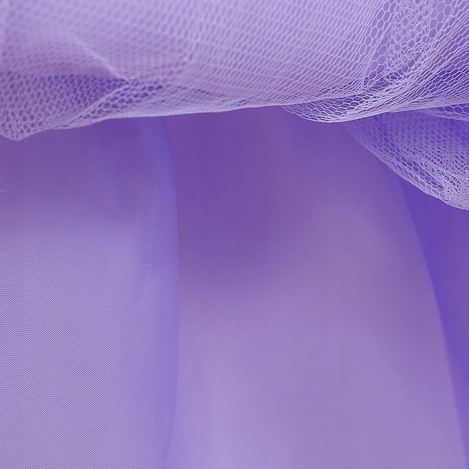 Низ складається з трьох сильно зібраних шарів: фіолетова підкладка всередині, жорстка сітчаста спідниця всередині та атлас із вставкою з тюлю спереду.