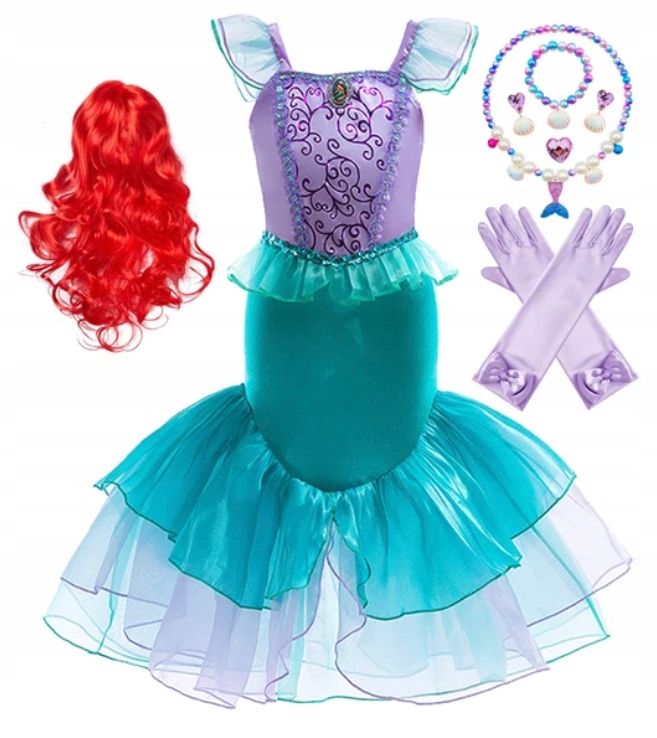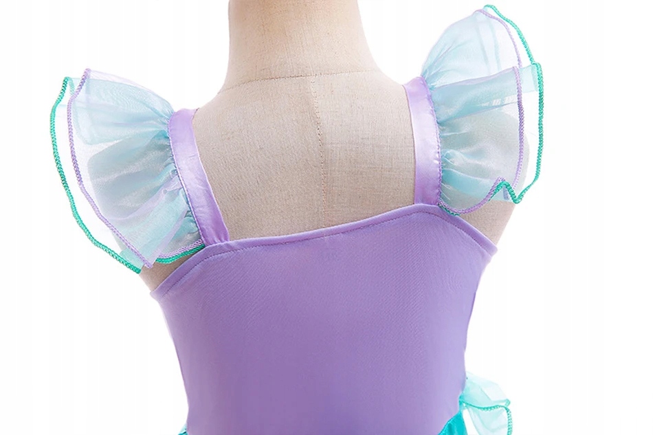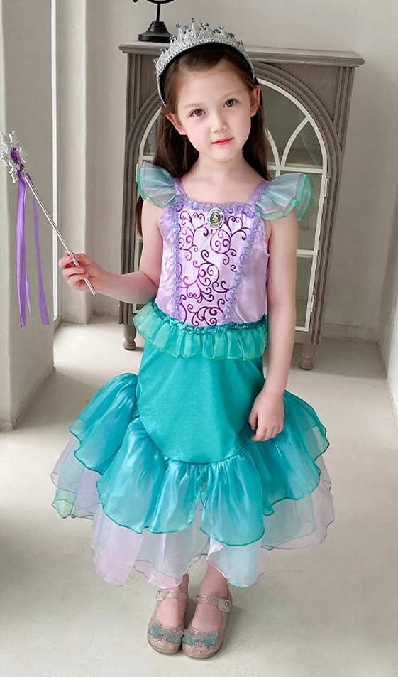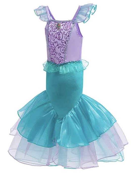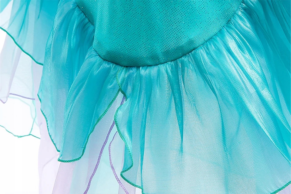 Це чудова сукня у водному світі Аріель. Вбрання дуже гарно виготовлене, з мерехтливих та блискучих тканин. Гарно сидить по фігурі дитини. Внизу волан з тюлю імітує великий хвіст русалки.