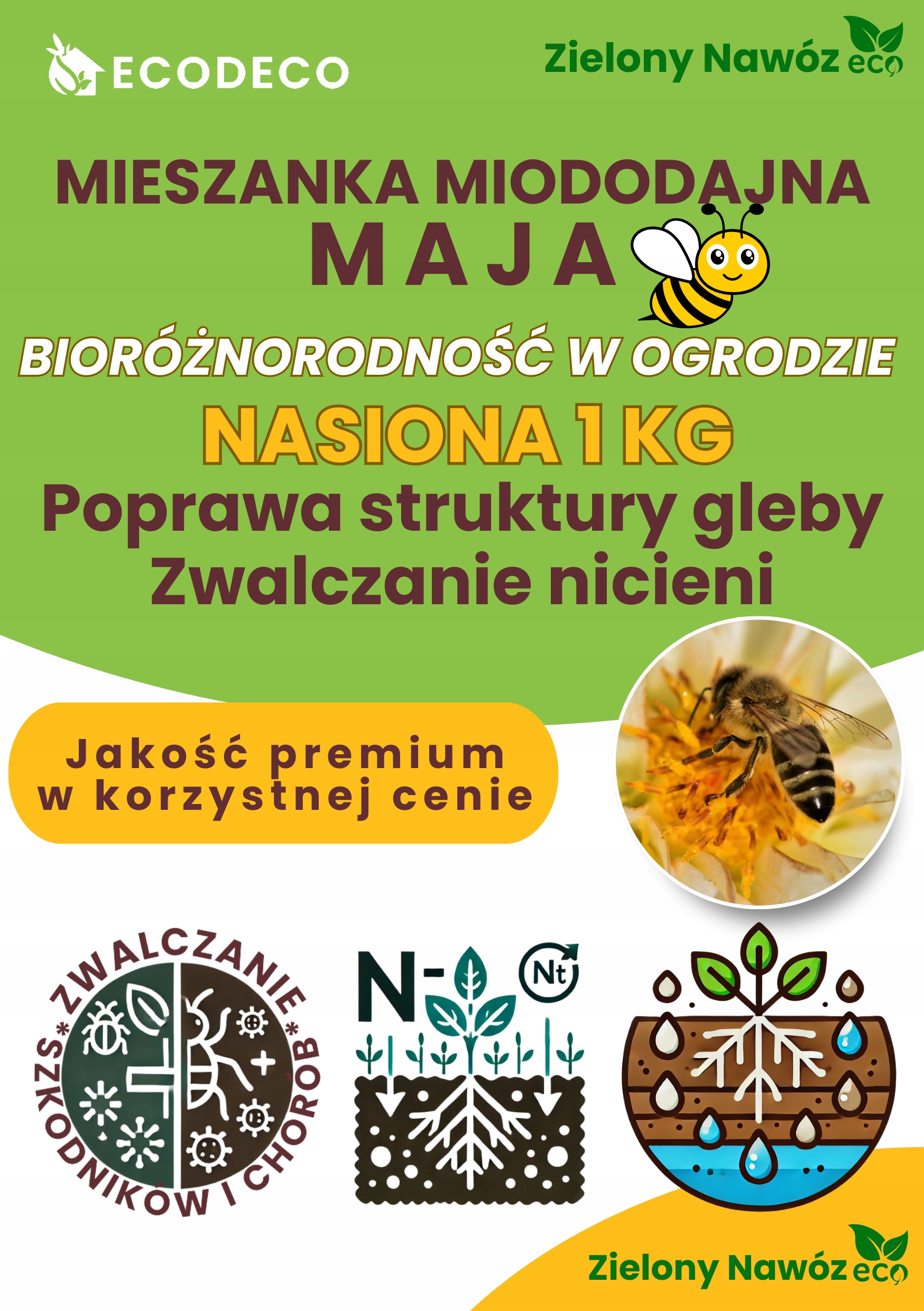 Резюме: Суміш Honey Maja - незамінний вибір для всіх, хто хоче залучити запилювачі, покращують якість ґрунту, захищають рослини від шкідників і підтримують місцеві екосистеми. Виберіть нашу суміш Miododajna Maja і насолоджуйтесь здоровий, пишний сад протягом усього сезону!