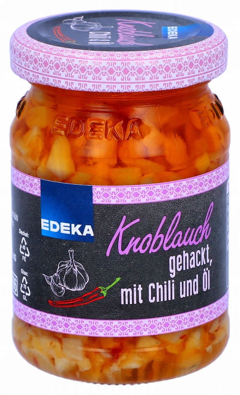 часник, чилі та ріпак - тріо, яке не бере ув'язнених. Edeka Knoblauch Gehackt Myth Chili und Öl - це готовий, нарізаний часник з додаванням пелюстків чилі, укладеним у банку та готовим до кулінарних дій. Просто чайна ложка, щоб розігріти сковороду, маринад або салат. Баночка для тих, хто не боїться інтенсивних ароматів і ... часникової правди. Особливості продукту