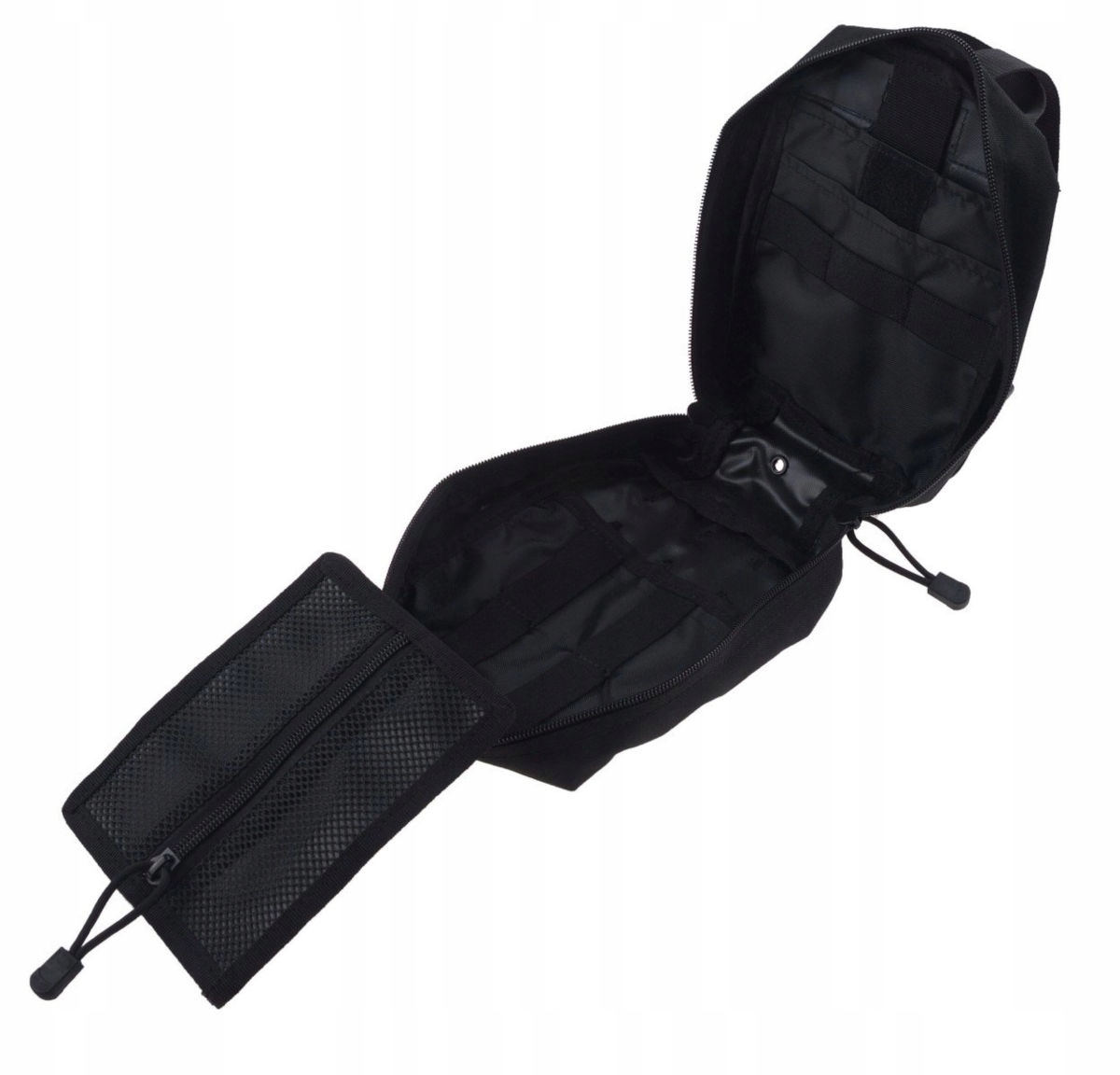 Набір першої допомоги закритий за допомогою блискавки . Всередині є організатор для всіх корисних предметів у комплекті першої допомоги: пов’язки, ножиці тощо. Внутрішня стінка оснащена двома плоскими кишенями , включаючи одну захищену стрічку з липучкою, на одному друзі з кишеньковими друзями з гнучким матеріалом був пришитний - вони ідеально підходять для перевезення бонд, ручки або хімічного світла. На зовнішній стіні є ще одна плоска кишеня, додаткові ремені, виготовлені з гнучкого матеріалу та плоский, сітчаста кишенька , закріплена на блискавці,