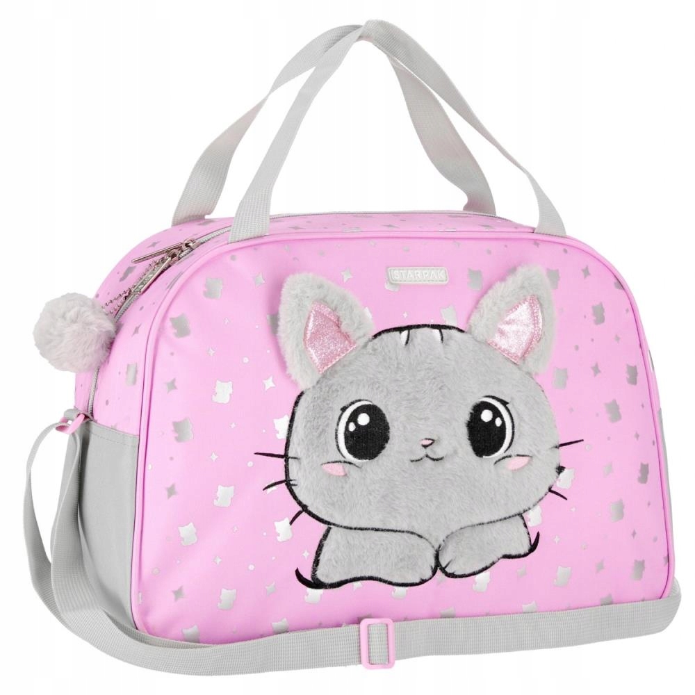 Велика, містка сумка для дівчинки, містке відділення, обшите підкладкою, що легко миється, малюнок Котик, регульований плечовий ремінь, міцна блискавка з декоративним помпоном.