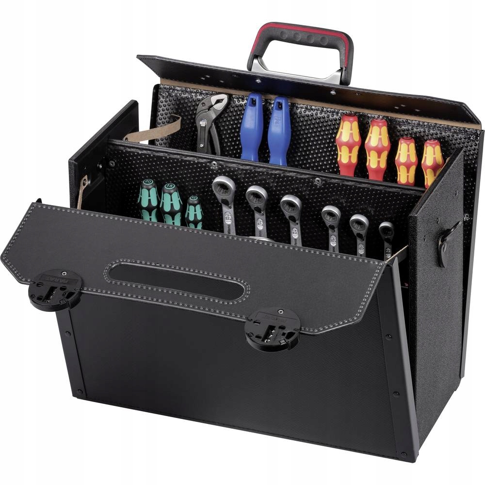 Чорна сумка для інструментів із коров’ячої шкіри має стабільну передню частину , середня і задня стінки. Передня і задня стінки частково відкриті і мають один інструментотримач CP-7 для багатьох інструментів різного діаметру. Стінки клапанів кріпляться до бічних стінок сумки для інструментів, що полегшує її складання. Алюмінієва опора, розміщена на бічних стінках, забезпечує більшу стійкість і водночас захист від ударів і ударів. Також в жорсткій центральній частині є два інструментотримачі CP-7 для інструментів різного діаметру. Завдяки спеціально розробленим затискачам, тримач інструменту виготовлений з високоякісного пластику, і інструмент завжди залишається на місці. Чохол для сумки для інструментів, що складається з двох частин, має отвір для ручки та ручку ергономічної форми та закривається двома кодовими замками. Ремінець для перенесення можна прикріпити з боків кришки очей. Це робить високоякісну сумку для інструментів ще легшою для транспортування.