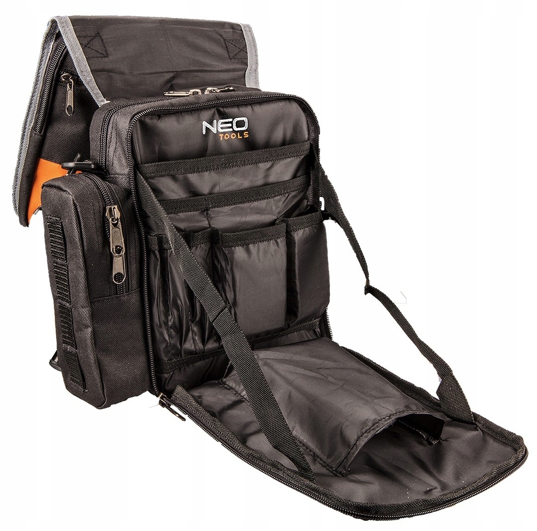 Сумка для інструментів NEO (арт. 84-315) з армованого поліестеру, має 4 зовнішні та 4 внутрішні кишені. Містке основне відділення вмістить багато інструментів. Додатковою перевагою є складна конструкція, що полегшує роботу. Сумка має регульований плечовий ремінь, ручку для перенесення та гачки для пояса для зручного використання.
