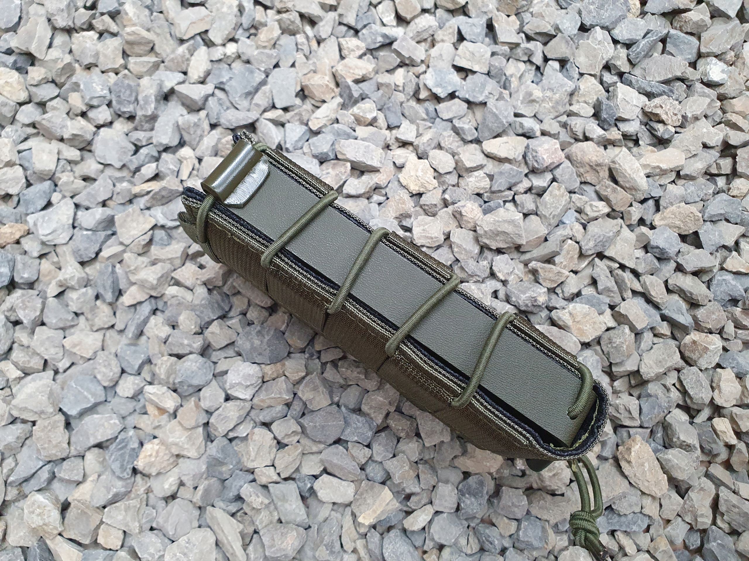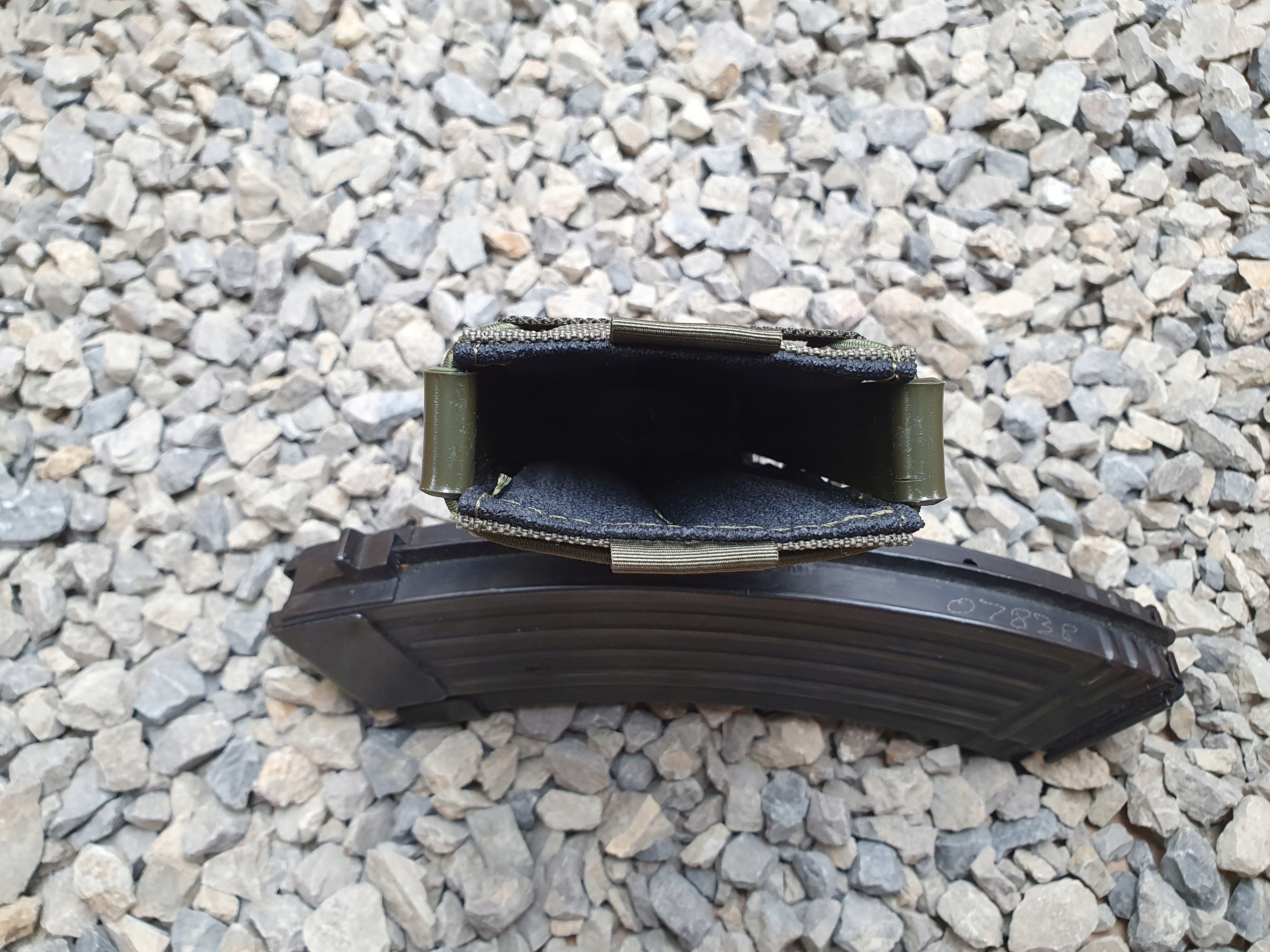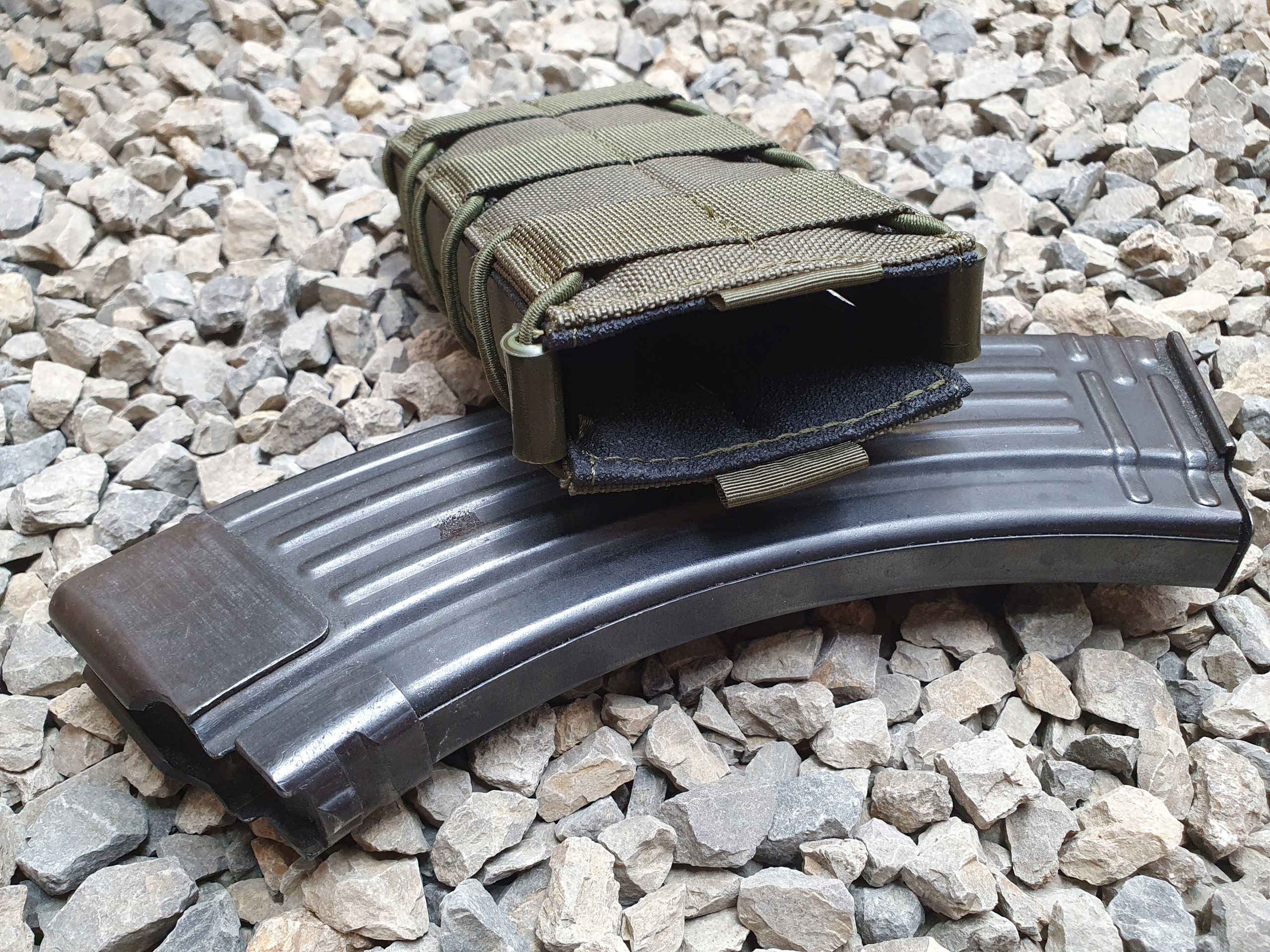 Підсумок для магазину для АК або аналогічного розміру з сучасним дизайном. Задня і передня сторони кишені наповнені тонким пінопластом дуже високої щільності, який забезпечує додаткову жорсткість і тиск на гумову нековзку тканину, що утримує магазин. Борти з кайдекса забезпечують високу жорсткість боків і запобігають згортанню отвору, що робить повторне вставлення магазину майже таким же зручним та інтуїтивно зрозумілим, як і його виймання. Крім того, гладка поверхня вставок Kydex з внутрішньої сторони полегшує вставлення та додаткове відкриття сумки, обмотаної еластичним шок-кордом. Однак матова зовнішня сторона надає тактичного вигляду та не відбиває світло.