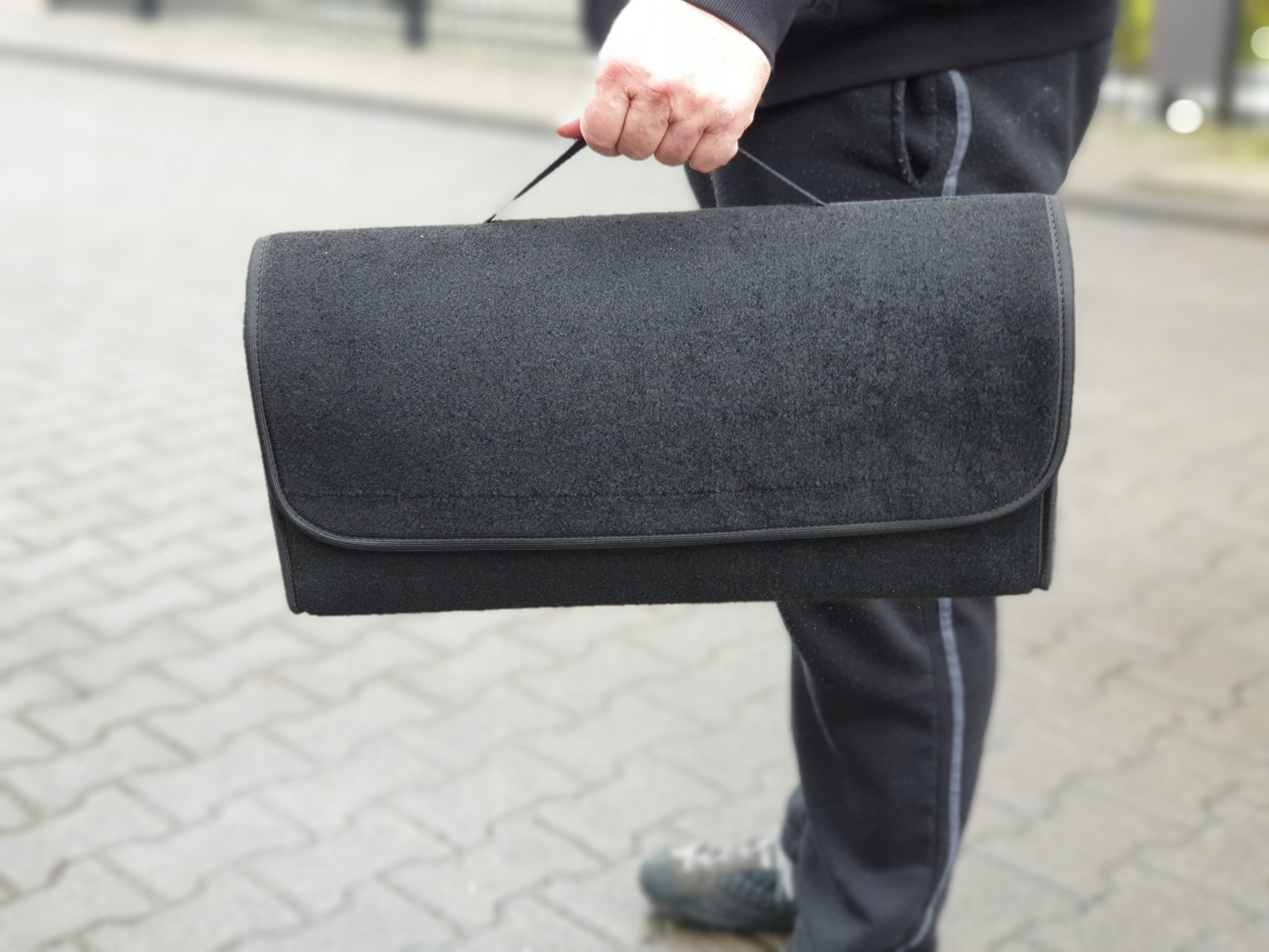 Матеріал, з якого зшилася сумка, товста килимка чорна. Крім того, липучка була пришита ззаду та дна організатора, за допомогою якого ми можемо прикріпити організатор до килима в нашому багажнику (якщо він станеться). Фото нижче: