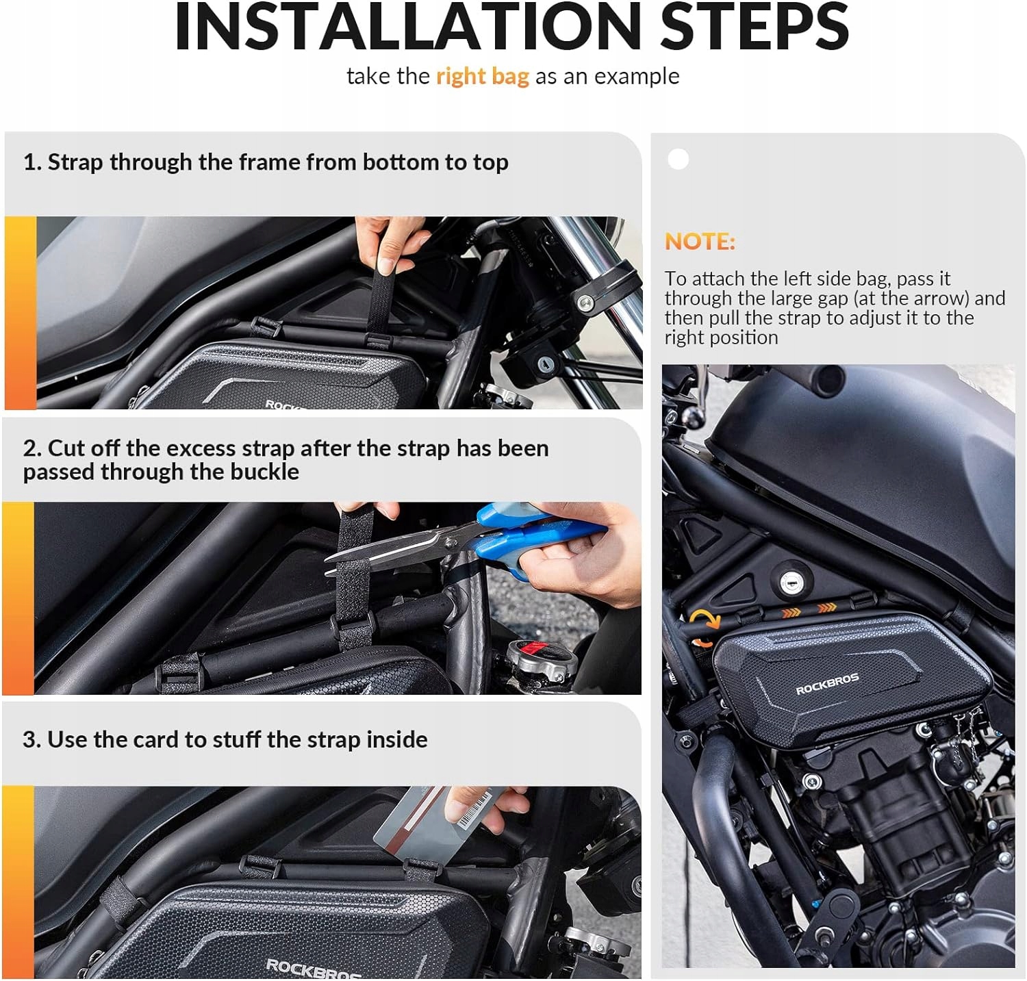 - 【ЛЕГКЕ ЗБИРАННЯ】Завдяки 3 регульованим застібкам-липучкам ви можете легко встановити цю мотоциклетну сумку у відповідне положення , легко встановлювати/розбирати, надійно тримати за будь-яких умов, продовжуйте весело керувати!