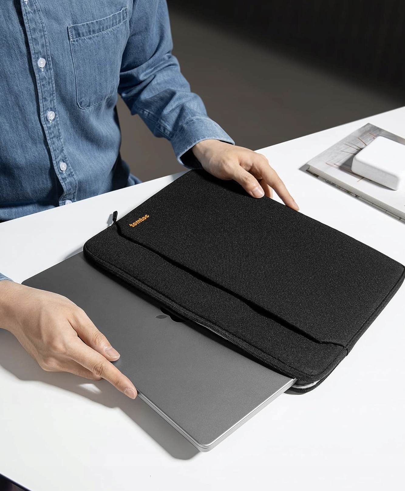Tomtoc Light A18 — легкий чохол для 14-дюймових ноутбуків — має одне відділення та передню кишеню. Кришка застібається на блискавку вздовж верхньої сторони створений для MacBook Air, до якого ідеально підходить обкладинка з делікатного матеріалу, а в чохол вшита товста блискавка -відомий і шанований японський бренд Обкладинка має елегантний мінімалістичний дизайн.
