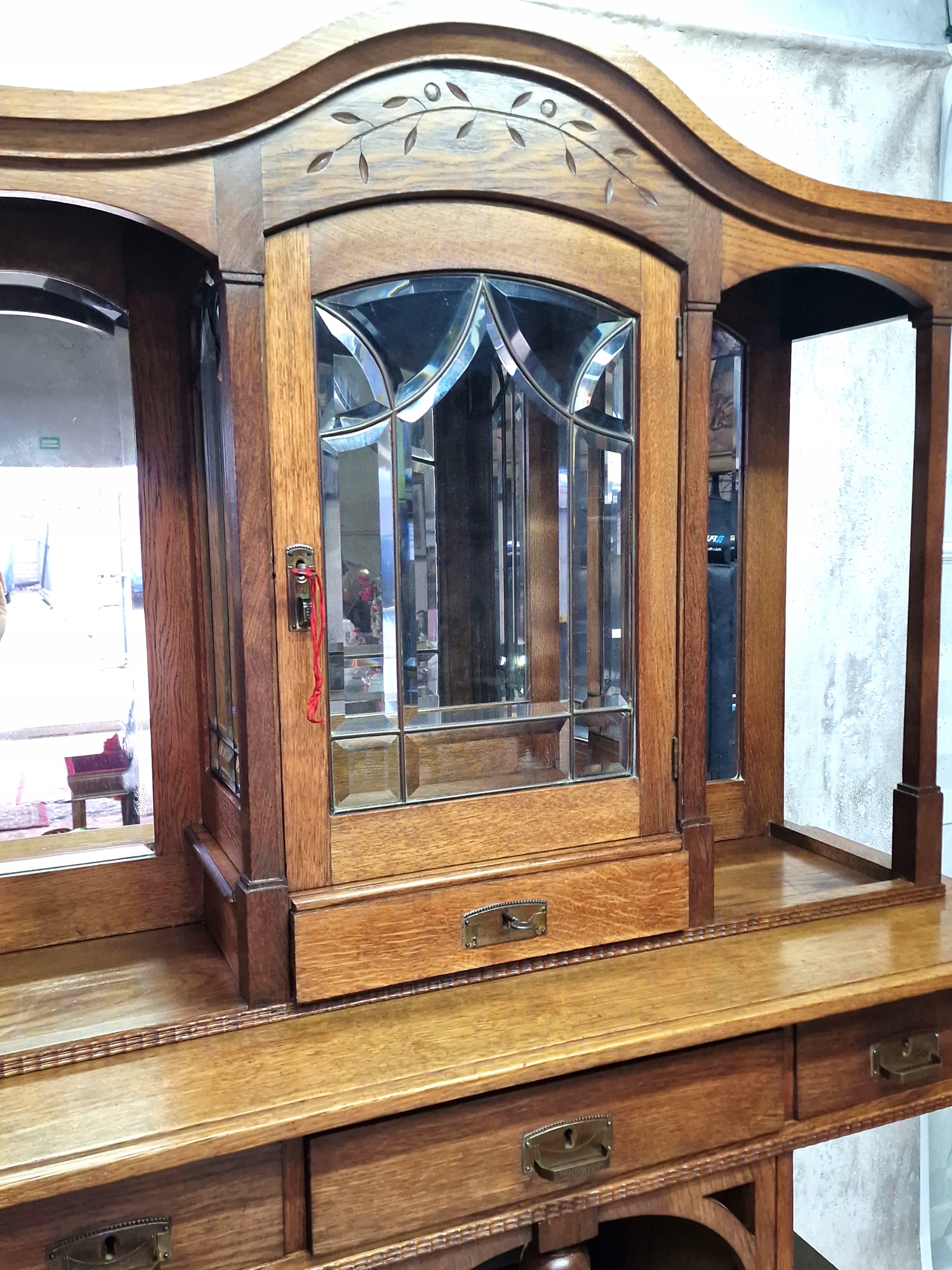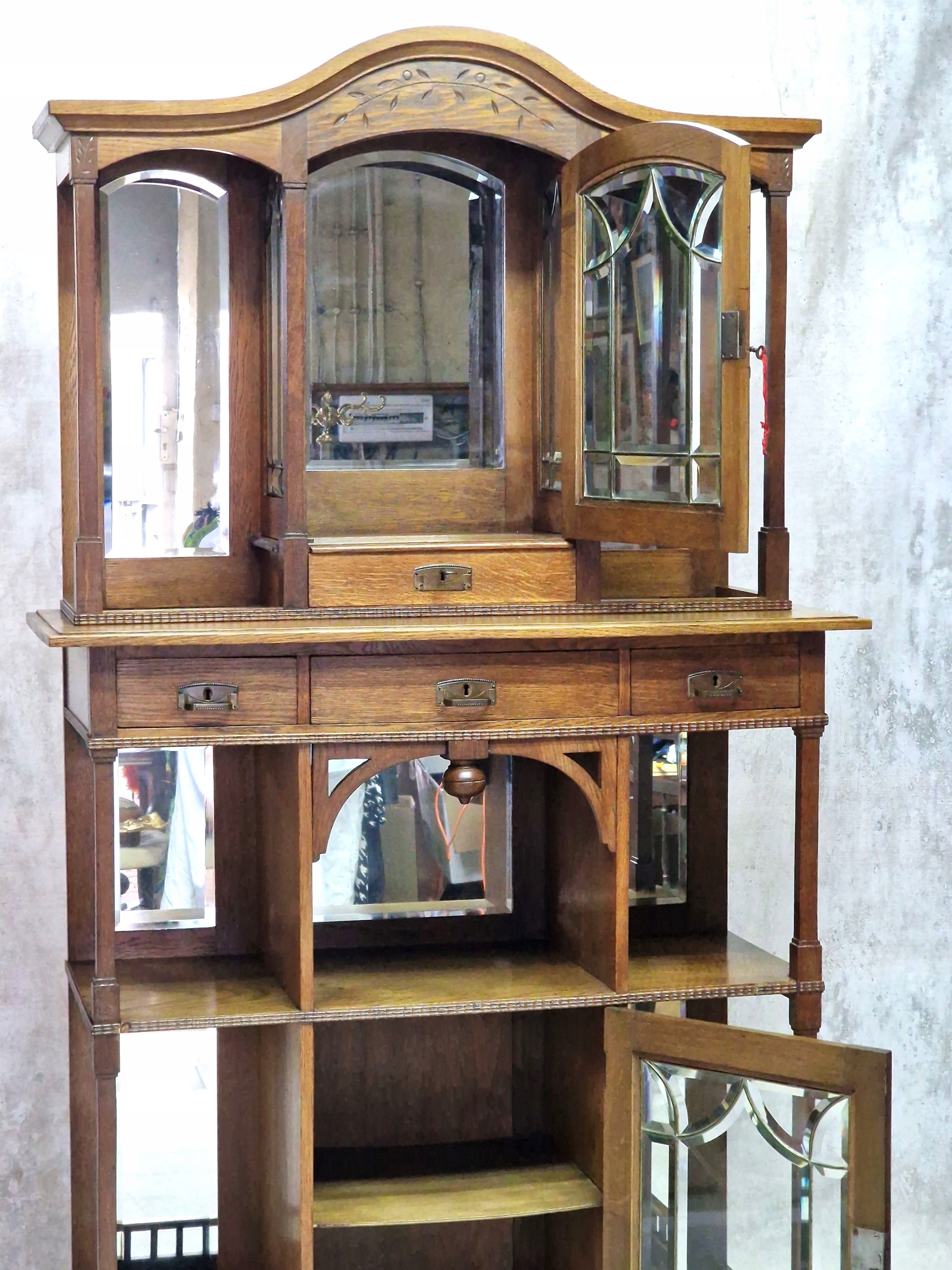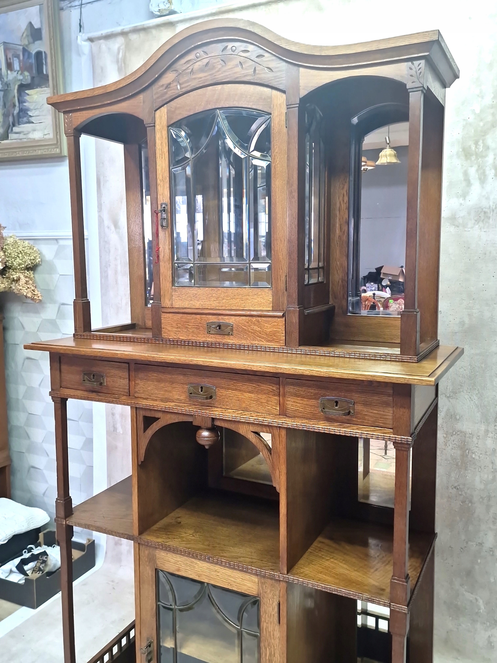 Шафа-вітрина з дуба середнього кольору, прикрашена тонким різьбленням