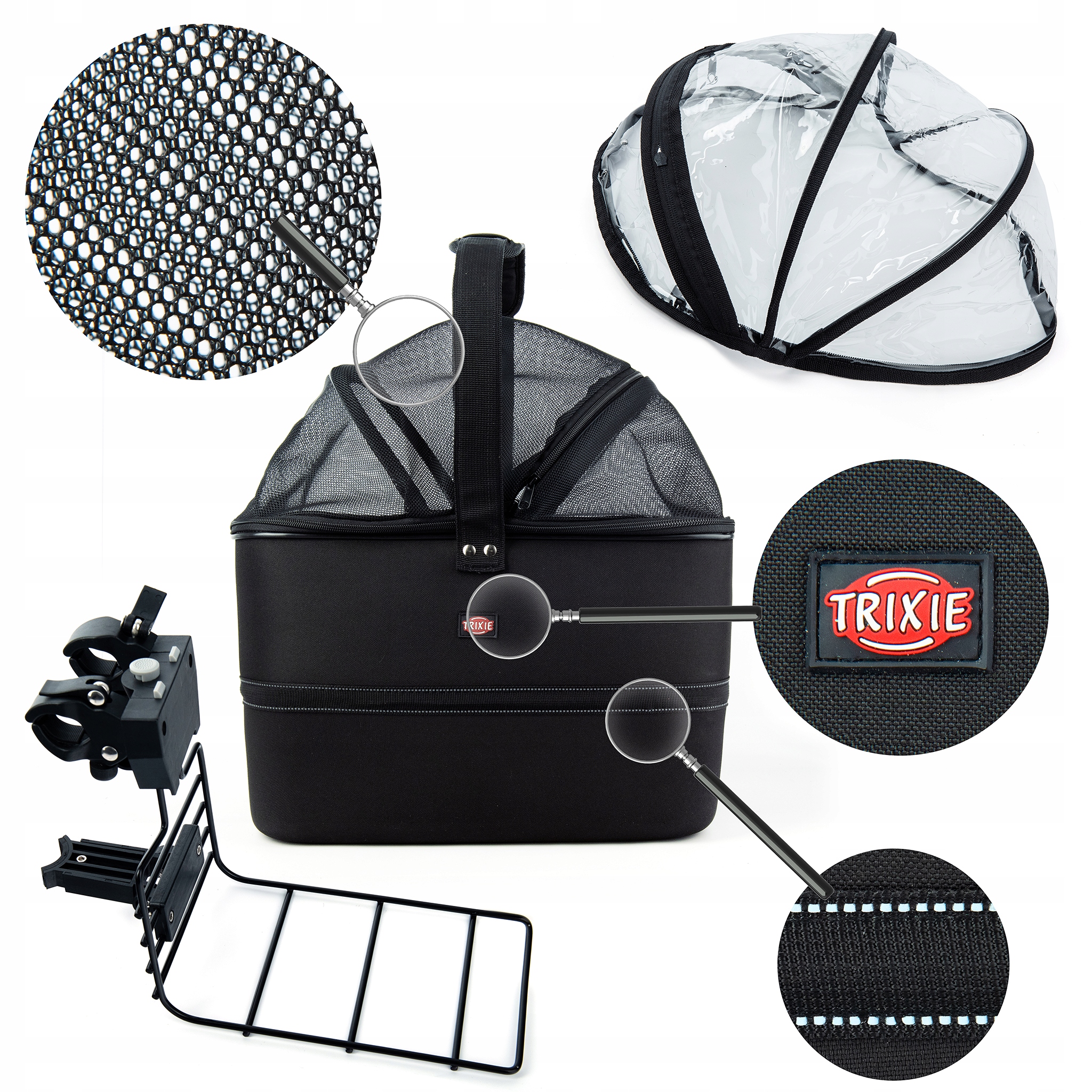 Основні особливості цієї переноски включають тверду раму з металу та міцного пластику, до якої сумка кріпиться за допомогою застібок і липучок. Кріплення рами до керма характеризується високою міцністю, стабільністю та простотою установки, працює за принципом затиску.