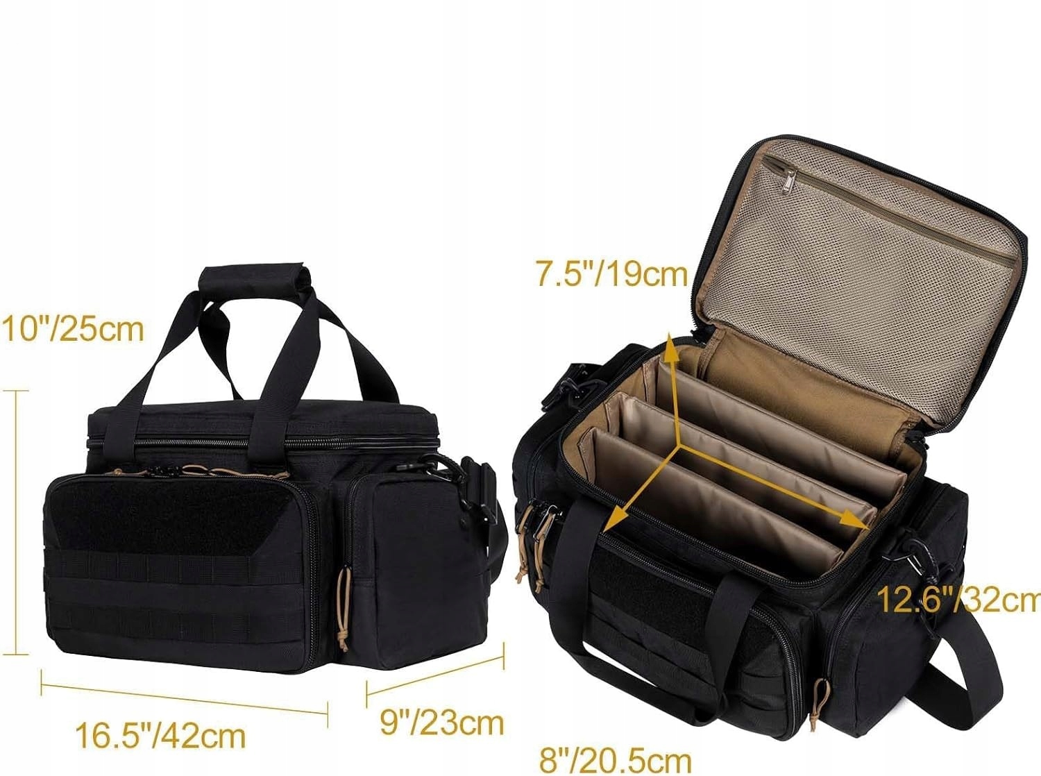 Внутрішня частина сумки з розмірами 32 x 20,5 x 19 см була розроблена спеціально для передачі короткої зброї, боєприпасів та аксесуарів.