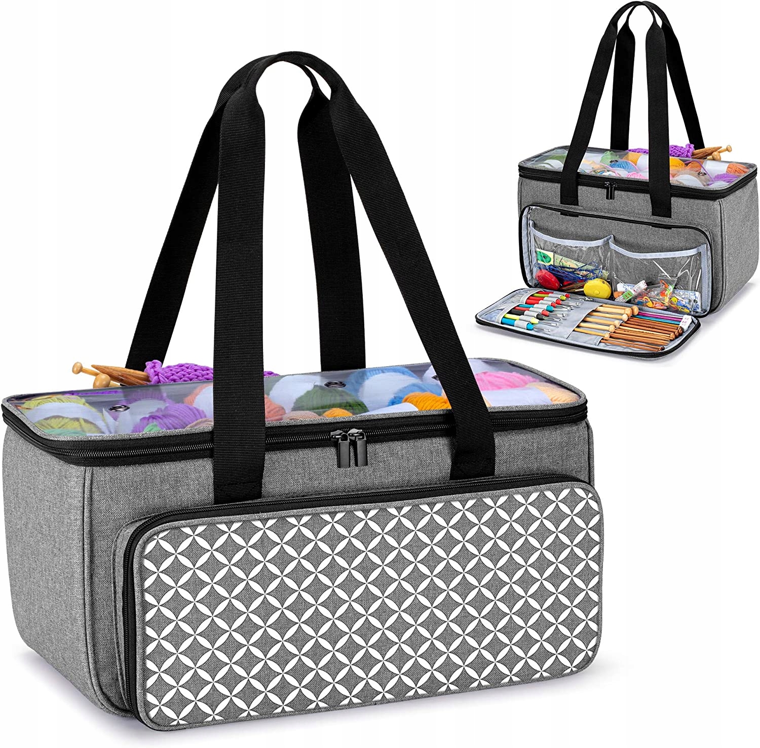 - БУДЬТЕ ОРГАНІЗОВАНИМИ - Переднє відділення з 2 прозорими кишенями та кількома еластичними ремінцями для в’язальних гачків, гачків з підсвічуванням та інших аксесуарів для в’язання, таких як ножиці, рулетка, маркери для стібків тощо. З глибокими отворами для голок (до 14"/35,5 см) І 1 задня кишеня з кнопкою для незавершених проектів.