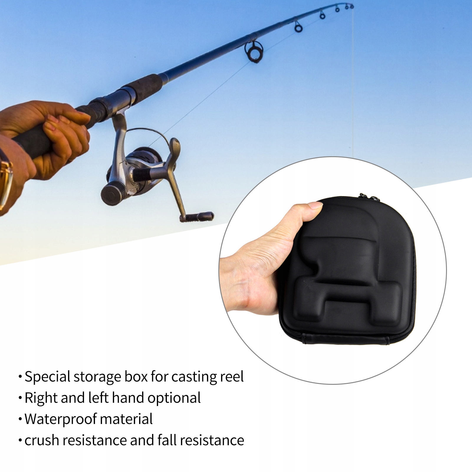 1. Виготовлений з високоякісної матеріалу з жорсткою оболонкою EVA, стиснутись нелегко, стійким до подрібнення та падіння. Легкий, простий у перенесенні, з двома параметрами правої та лівої руки на вибір, легше розпізнати. Внутрішній шар для зберігання має потовщену губку, високоякісна губка дуже хороша для запобігання зіткнень та використання рибного колеса. Водонепроникний поверхневий матеріал, стійкий до бризок, краще тримати котушку в сухість. Ідеальні аксесуари для захисту кастингу та щільно відповідають вашій котушці.