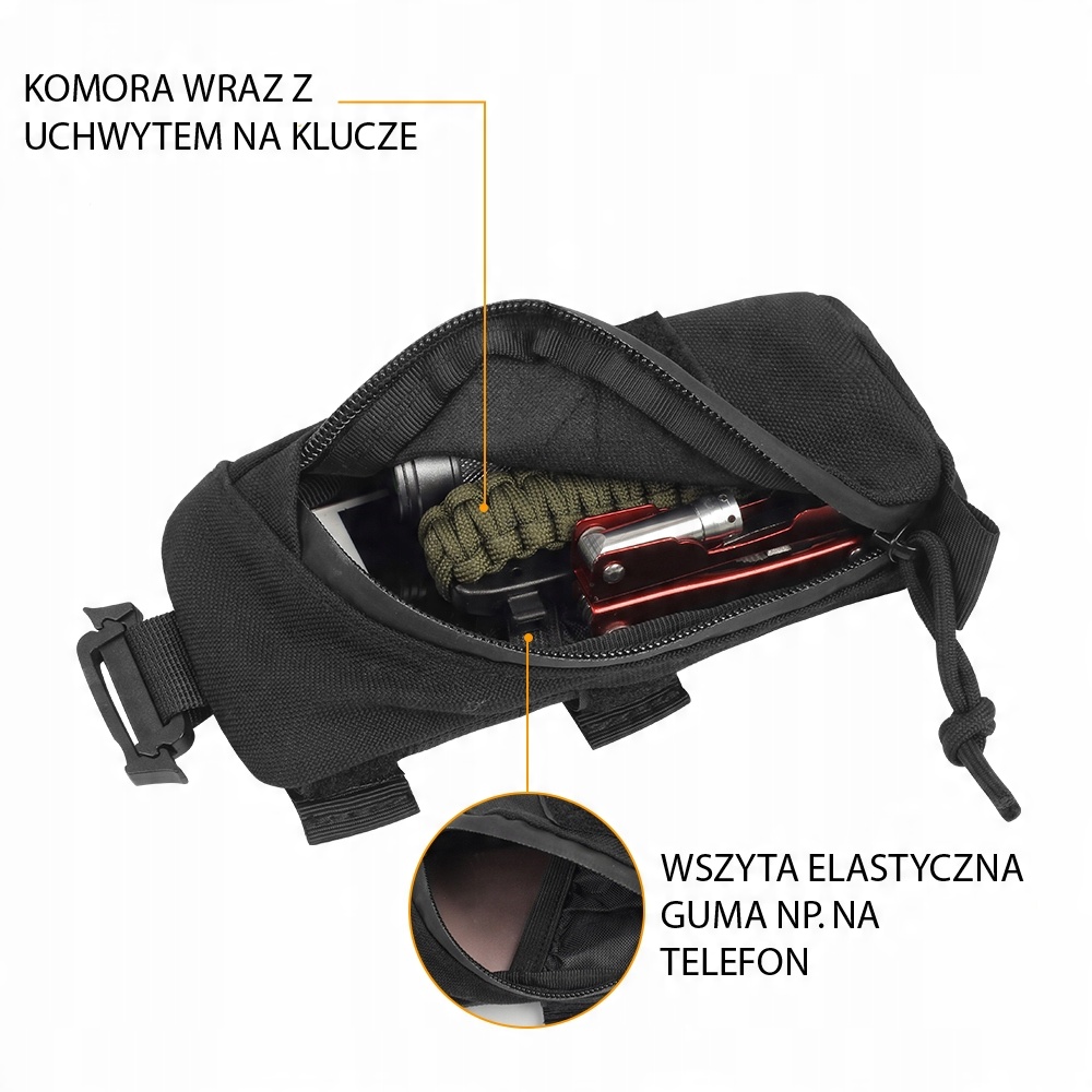 З цієї причини він ідеально підходить для важких умов. Це незамінний аксесуар під час подорожей, полювання, військових ігор, експедицій на виживання, ASG або армії. Навіть якщо ви не командос, ви можете легко знайти безліч застосувань для цієї просторої кишені в повсякденному житті.