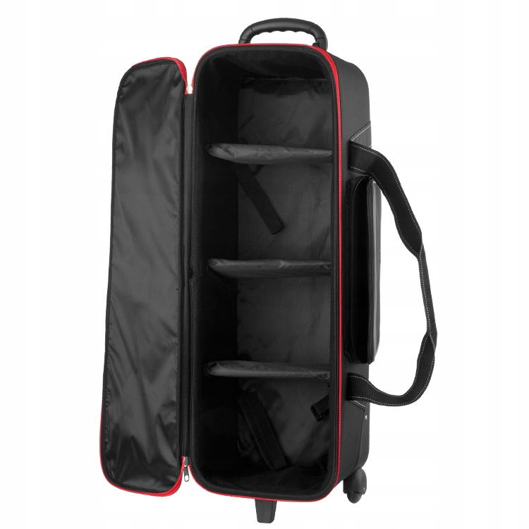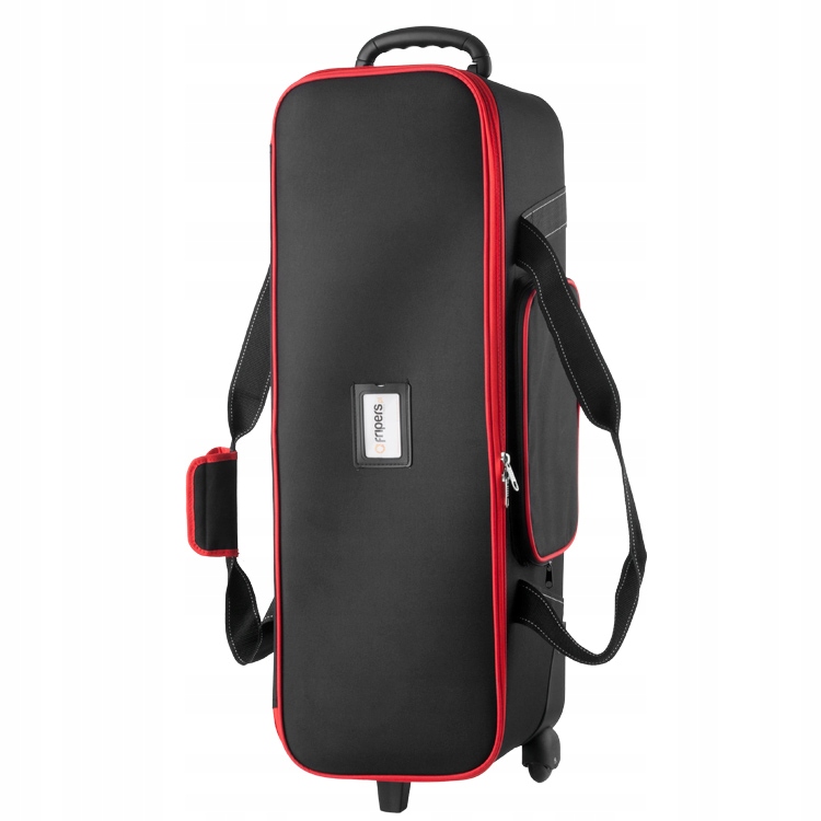 Велика сумка на колесах для безпечного транспортування студійного обладнання. Жорстка конструкція сумки зі стінками, заповненими товстим шаром амортизуючої піни, дуже добре захищає транспортоване обладнання від пошкоджень. Перегородки на липучках дозволяють підігнати салон під техніку, що транспортується, а ремені всередині сумки додатково зафіксують її. Збоку сумки є містка кишеня для дрібних аксесуарів, наприклад кабелів. Сумка виготовлена з високоякісної нейлонової тканини, стійкої до стирання. Дно сумки укріплено товстими пластиковими смугами, які також служать ніжками. На одній з коротких сторін розташовані два колеса і ніжка, що підтримує сумку у вертикальному положенні, а на протилежній стороні розташована міцна пластикова ручка. Крім того, сумка має два вушка, які скріплюються клапаном із широкої нейлонової стрічки.