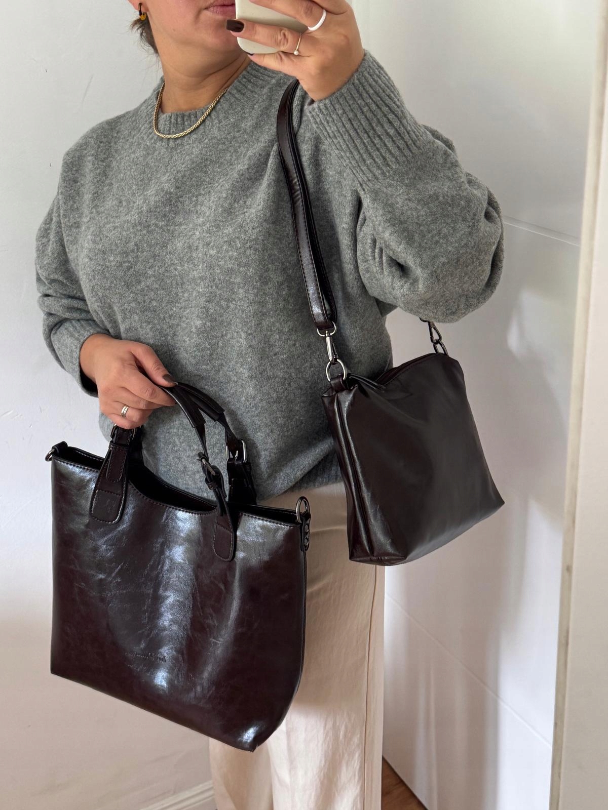 Коричнева сумка-шоппер Сумка-шоппер від французького бренду Ines Delaure характерної форми, виготовлена з екологічної шкіри, яка ідеально імітує натуральну шкіру.