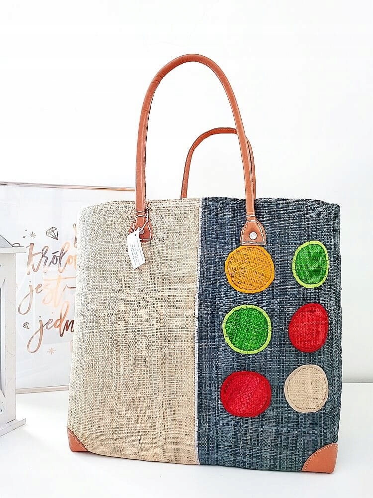 На передній частині кошика є декоративна аплікація з кольоровими колами.