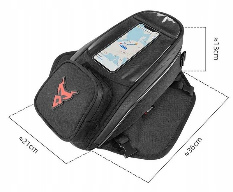 Мотоцентрична мотоциклетна сумка, яка кріпиться до бака за допомогою вбудованого магніту та ременів, що входять у комплект.